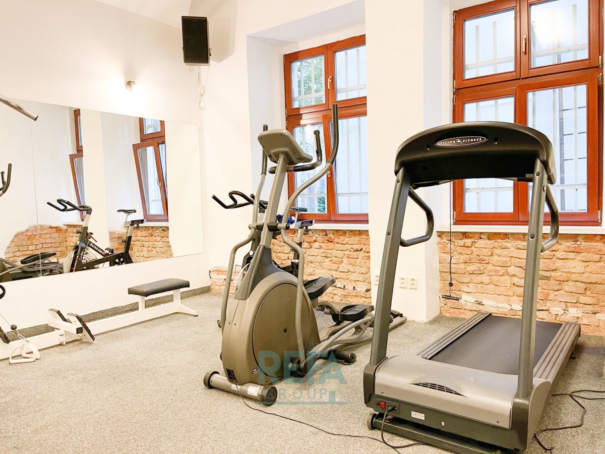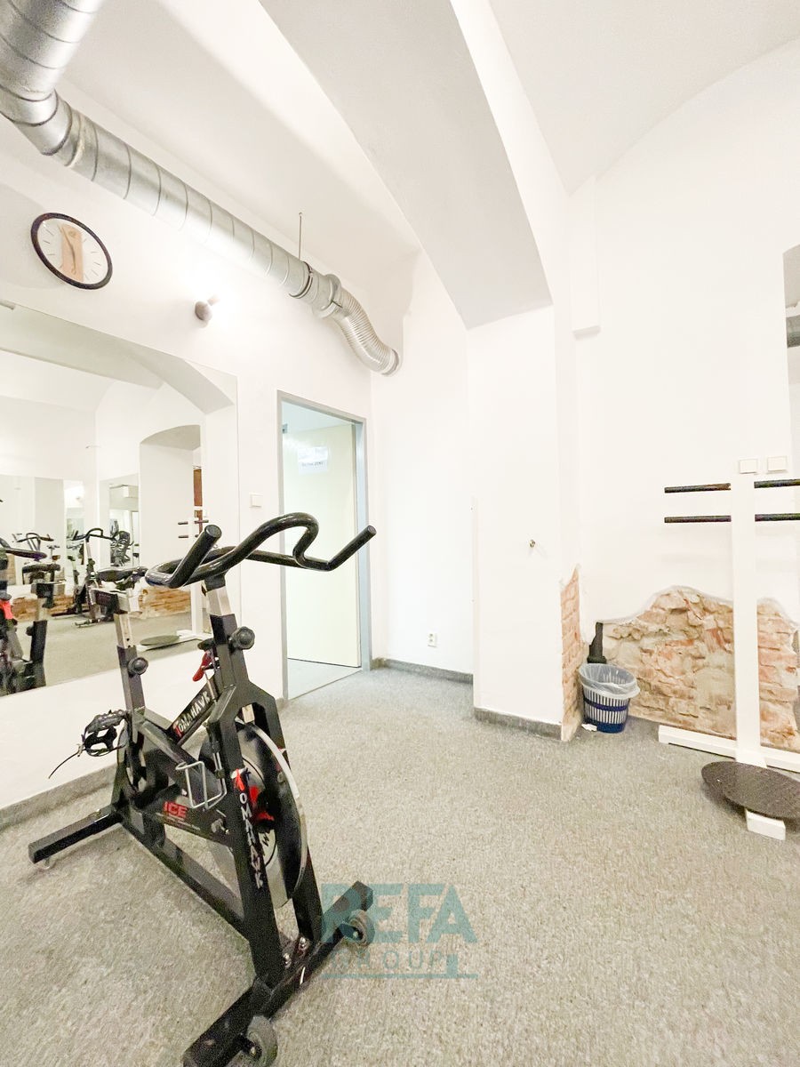 Podlahovými krytinami prostoru jsou kober...ce. Skoro celý prostor je prosvětlený okny. Možnost využití sprch. V ceně je také vybavení posilovny. Vstup přímo z ulice, přes recepci. Prostory zahrnují také zázemí šaten a sprch pro ženy i pro muže.
