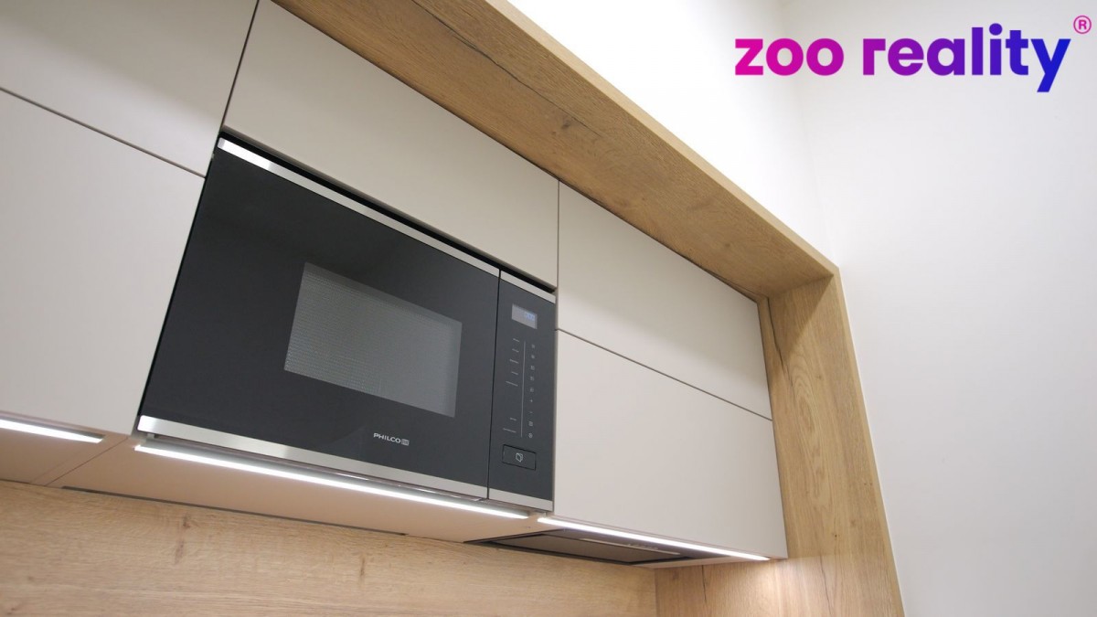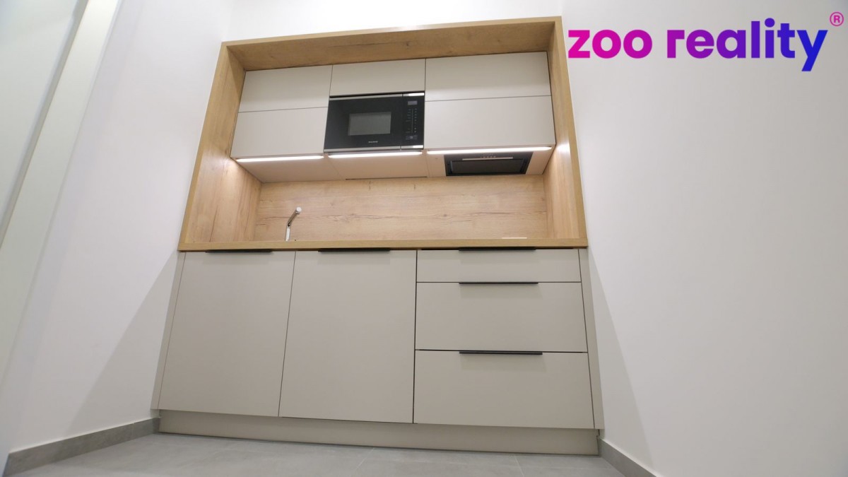 Kuchyň je vyrobena z masivní dýhy a osazena spotřebiči PHILCO, jako jsou dvouplotýnková indukční deska, digestoř, mikrovlnná trouba a myčka. Dále zde najdete dřez a dostatek prostoru pro volně stojící lednici. Koupelna je vybavena závěsným radiátorem, umyvadlem RAK CERAMICS, skřínkou a zrcadlem. Sprchový kout se skleněnou zástěnou a sociální zařízení WC GEBERIT RIMFREE pro zaměstnance doplňují komfortní vybavení.
