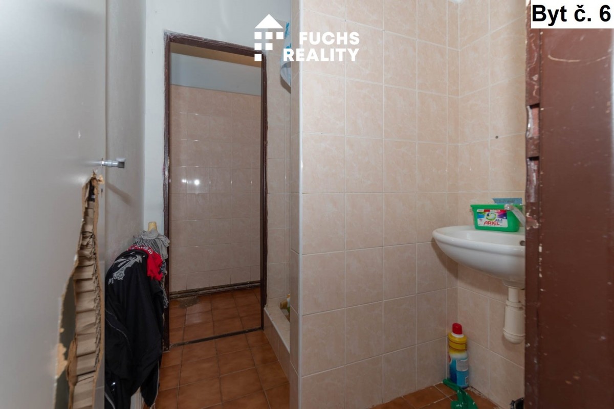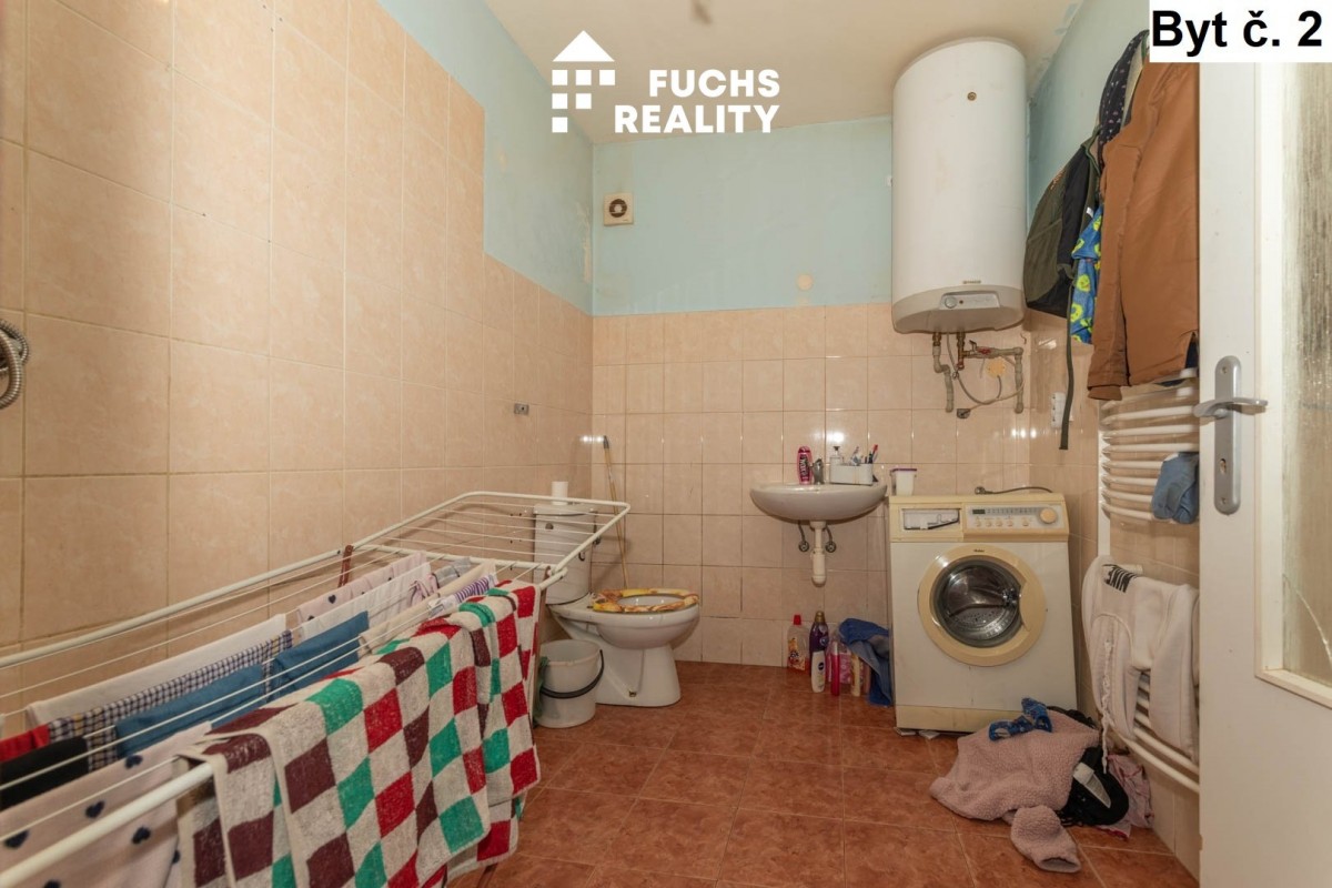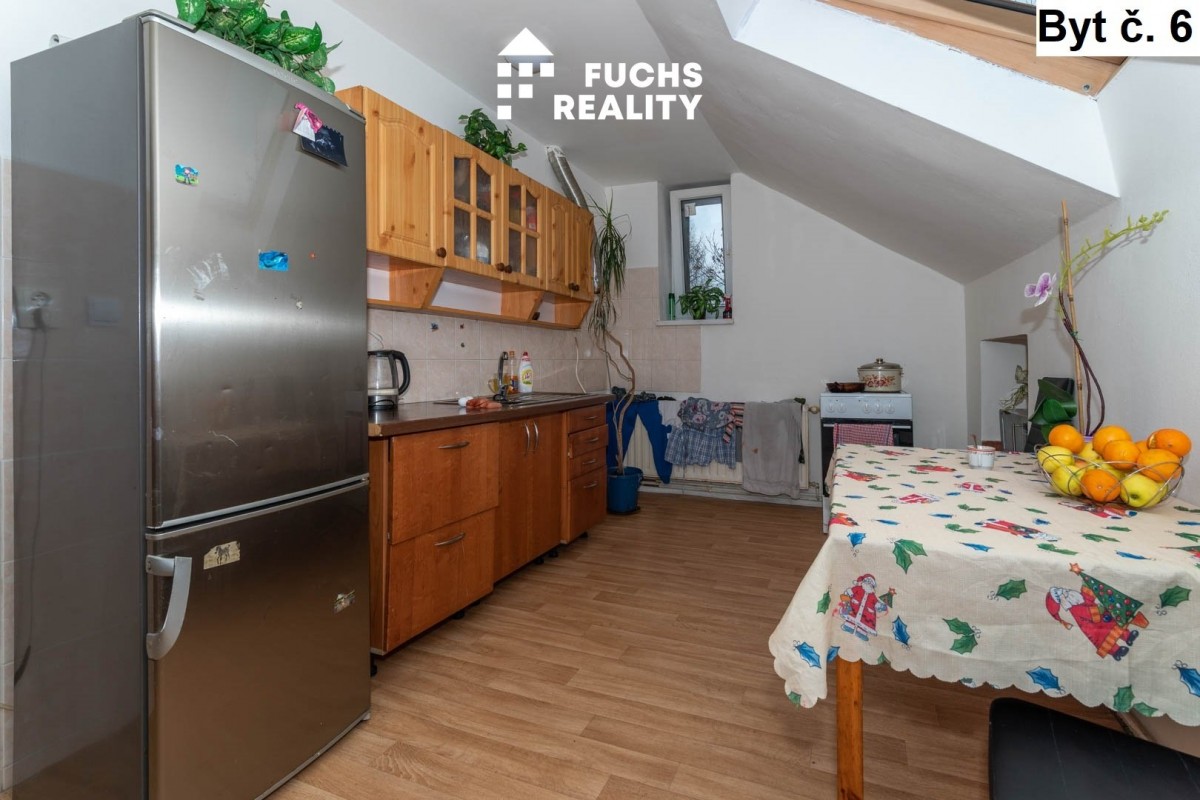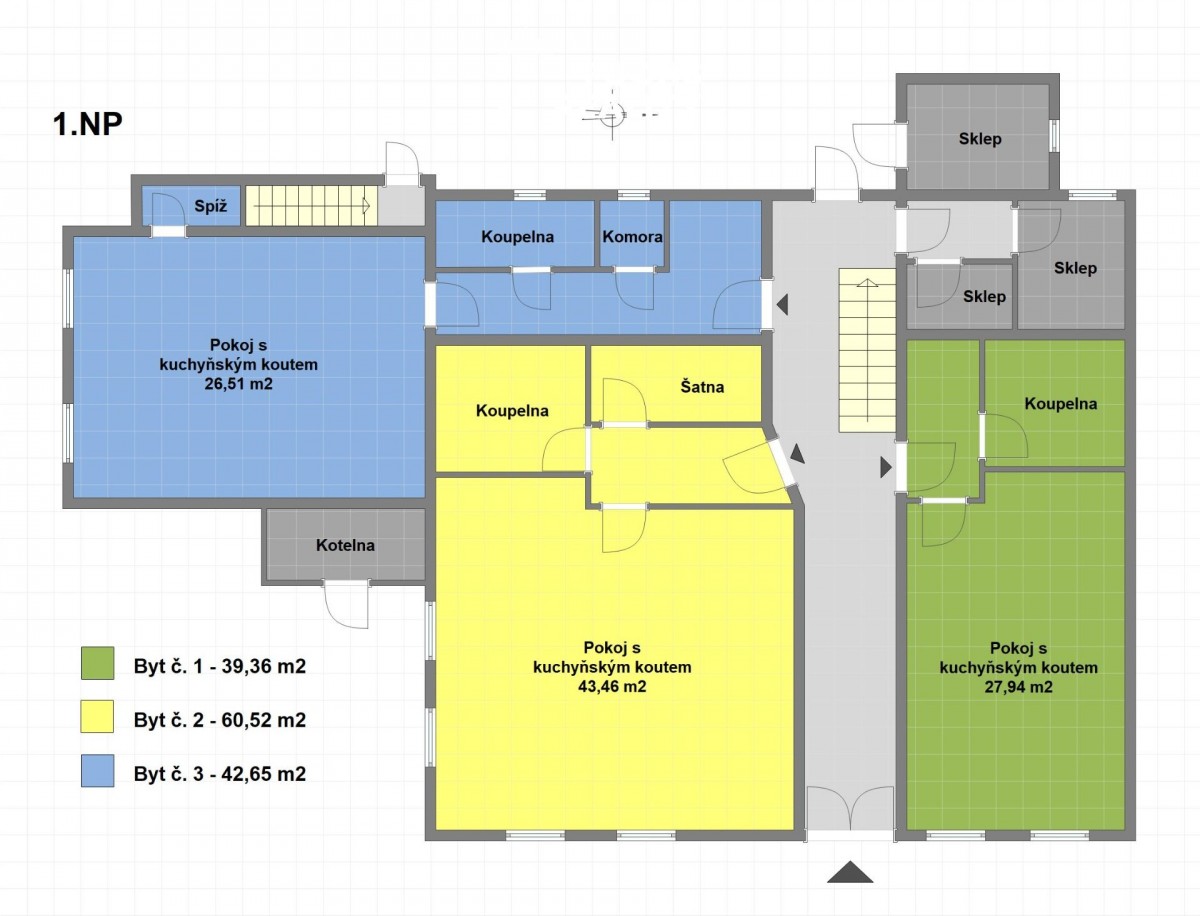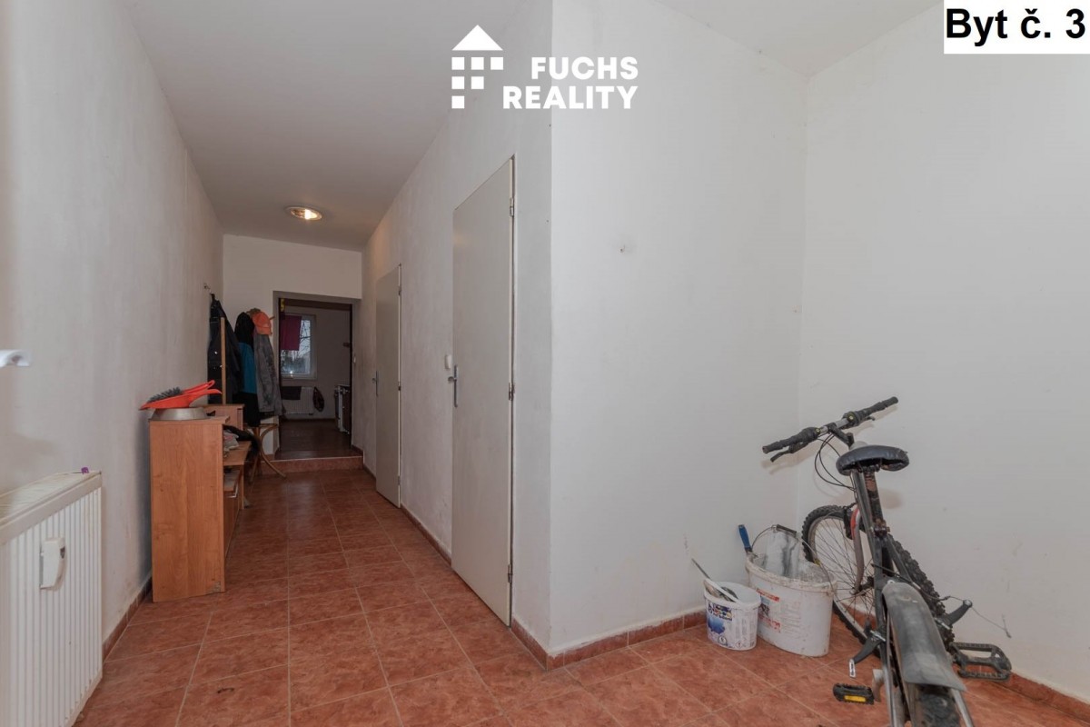 V prvním nadzemním podlaž...í, vpravo, se nachází byt č. 1 s dispozicí 1+kk o užitné ploše necelých 40 m2. Ve stejném podlaží, vlevo, je umístěn byt č. 2 s dispozicí 1+kk o výměře přes 60 m2. Třetím bytem na stejném podlaží je byt s dispozicí 1+kk se necelými 43 metry. Ke každému z těchto bytů tvoří příslušenství sklep. Ve druhém nadzemním podlaží jsou vybudovány opět tři byty, všechny s dispozicí 2+kk a výměrami od 38 do 45 m2. Ke každému bytu přísluší užívání jednoho ze tří sklepů. Vytápění objektu zajišťuje centrální plynový kotel, v každém bytě jsou radiátory osazeny měřiči spotřebovaného tepla. Voda je ohřívána individuálními bojlery. Měřiče elektřiny a vody jsou pro každý byt samostatné. Celý objekt je napojen na obecní kanalizaci.