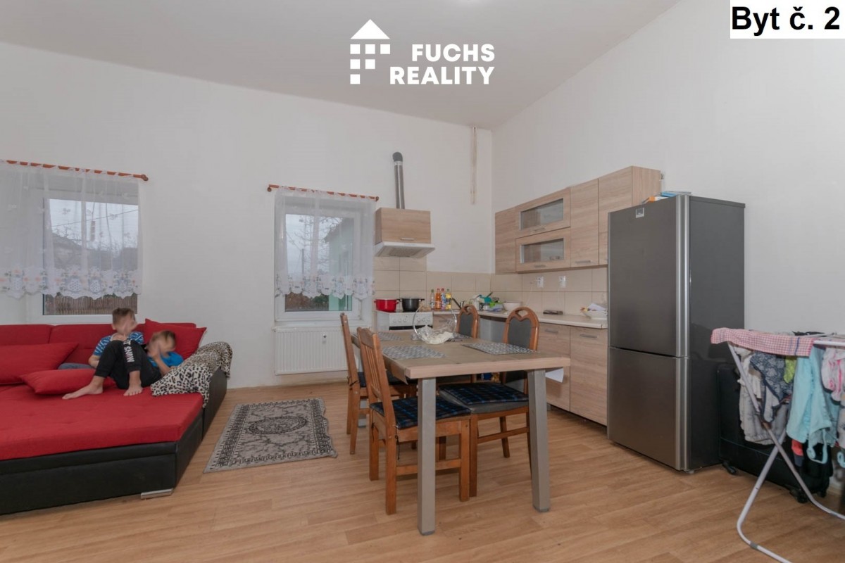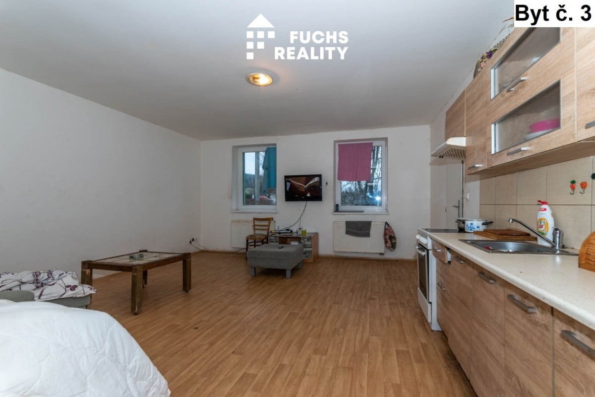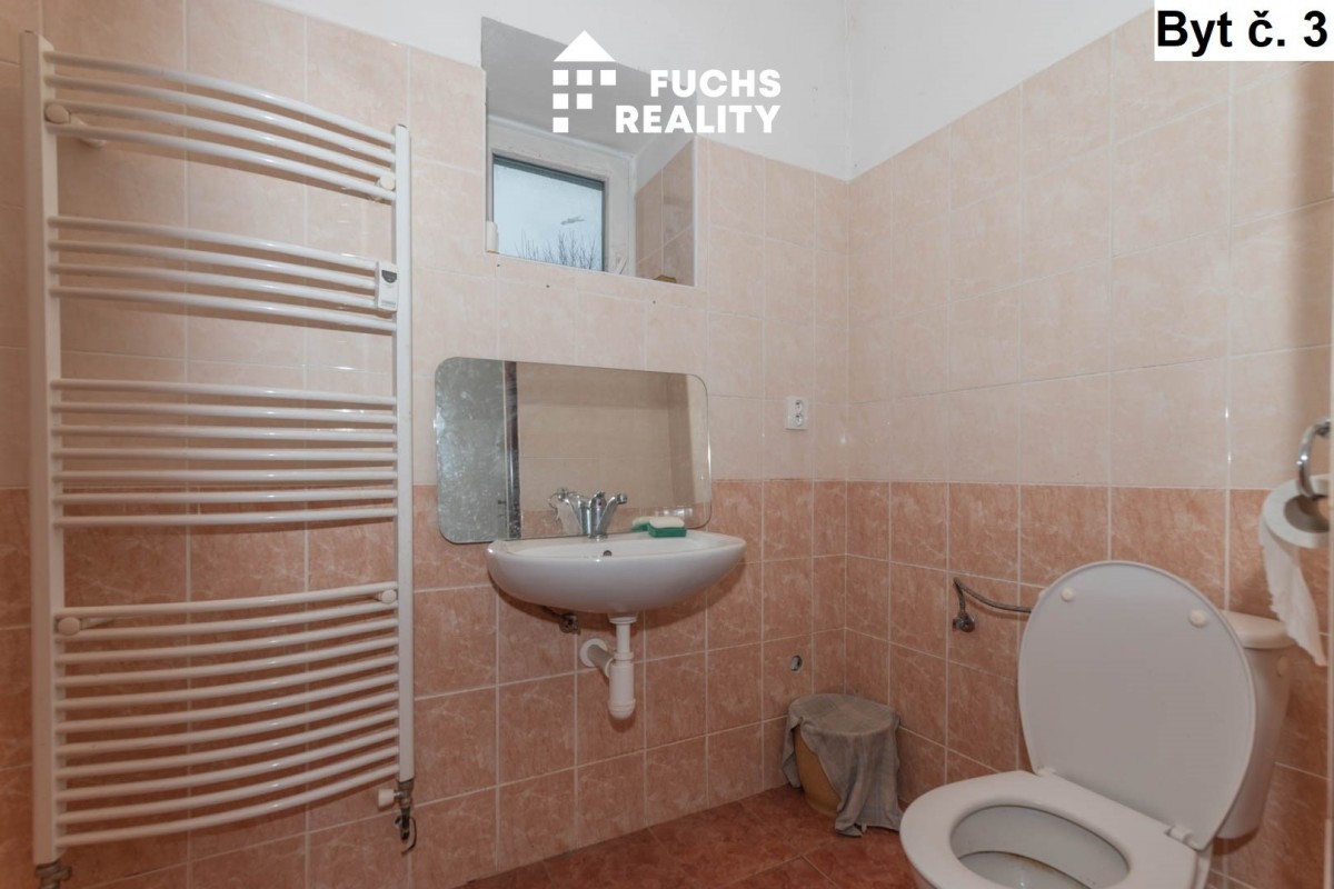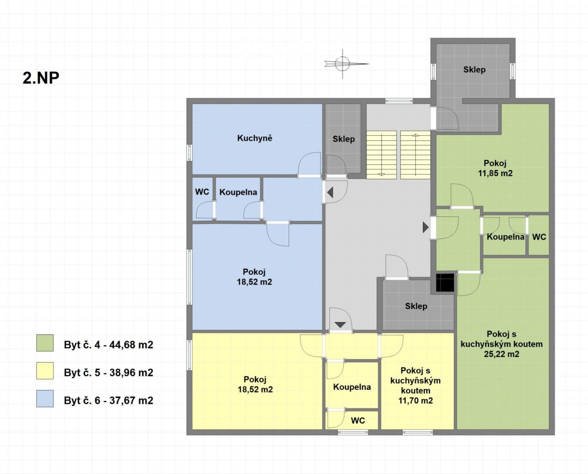 V prvním nadzemním podlaž...í, vpravo, se nachází byt č. 1 s dispozicí 1+kk o užitné ploše necelých 40 m2. Ve stejném podlaží, vlevo, je umístěn byt č. 2 s dispozicí 1+kk o výměře přes 60 m2. Třetím bytem na stejném podlaží je byt s dispozicí 1+kk se necelými 43 metry. Ke každému z těchto bytů tvoří příslušenství sklep. Ve druhém nadzemním podlaží jsou vybudovány opět tři byty, všechny s dispozicí 2+kk a výměrami od 38 do 45 m2. Ke každému bytu přísluší užívání jednoho ze tří sklepů. Vytápění objektu zajišťuje centrální plynový kotel, v každém bytě jsou radiátory osazeny měřiči spotřebovaného tepla. Voda je ohřívána individuálními bojlery. Měřiče elektřiny a vody jsou pro každý byt samostatné. Celý objekt je napojen na obecní kanalizaci.