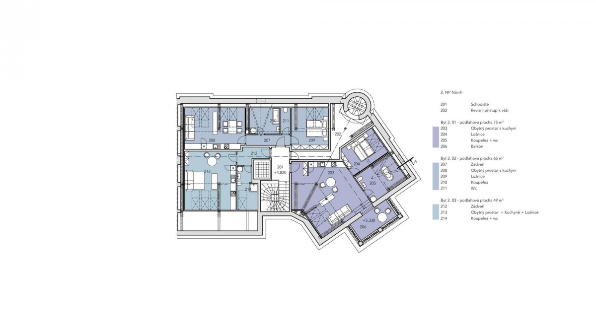 2. NP (druhé nadzemní patro) – navrženy 3 bytové jednotky