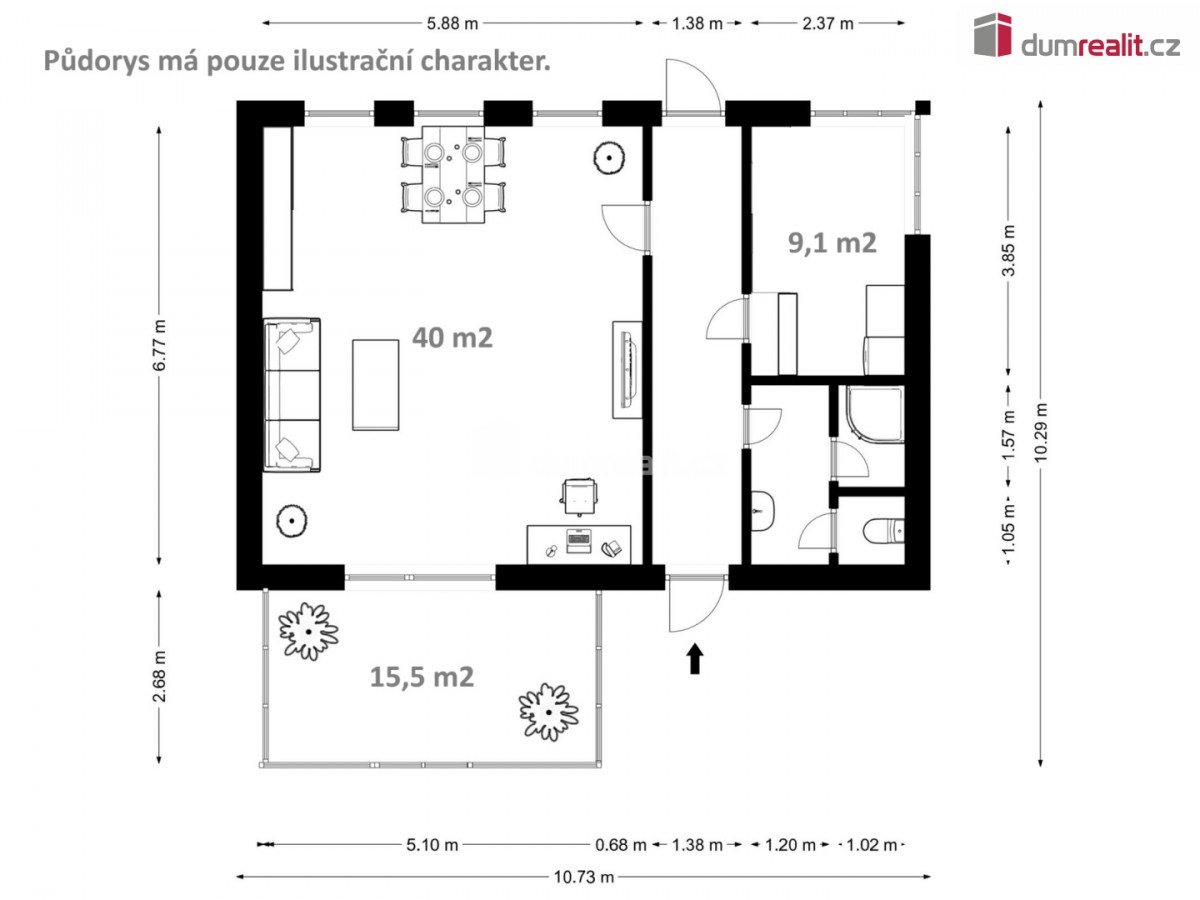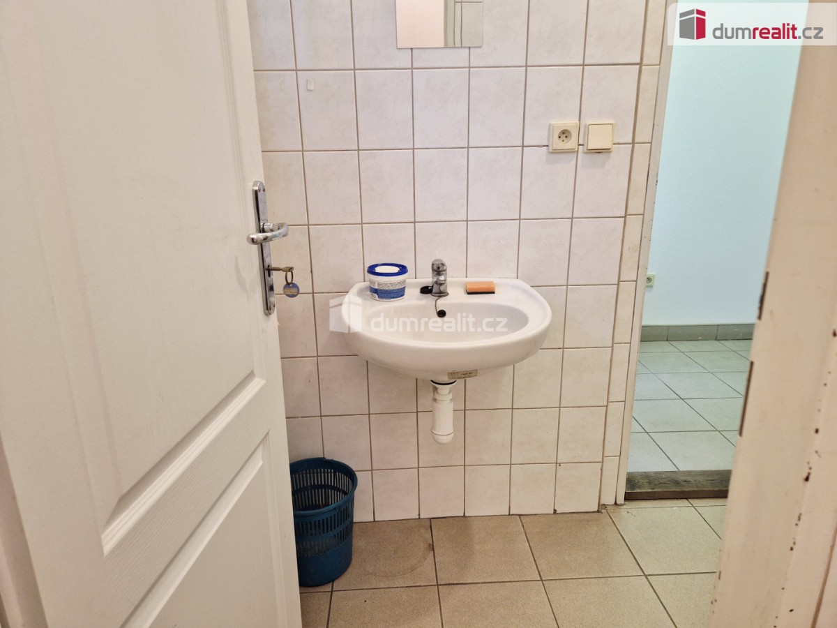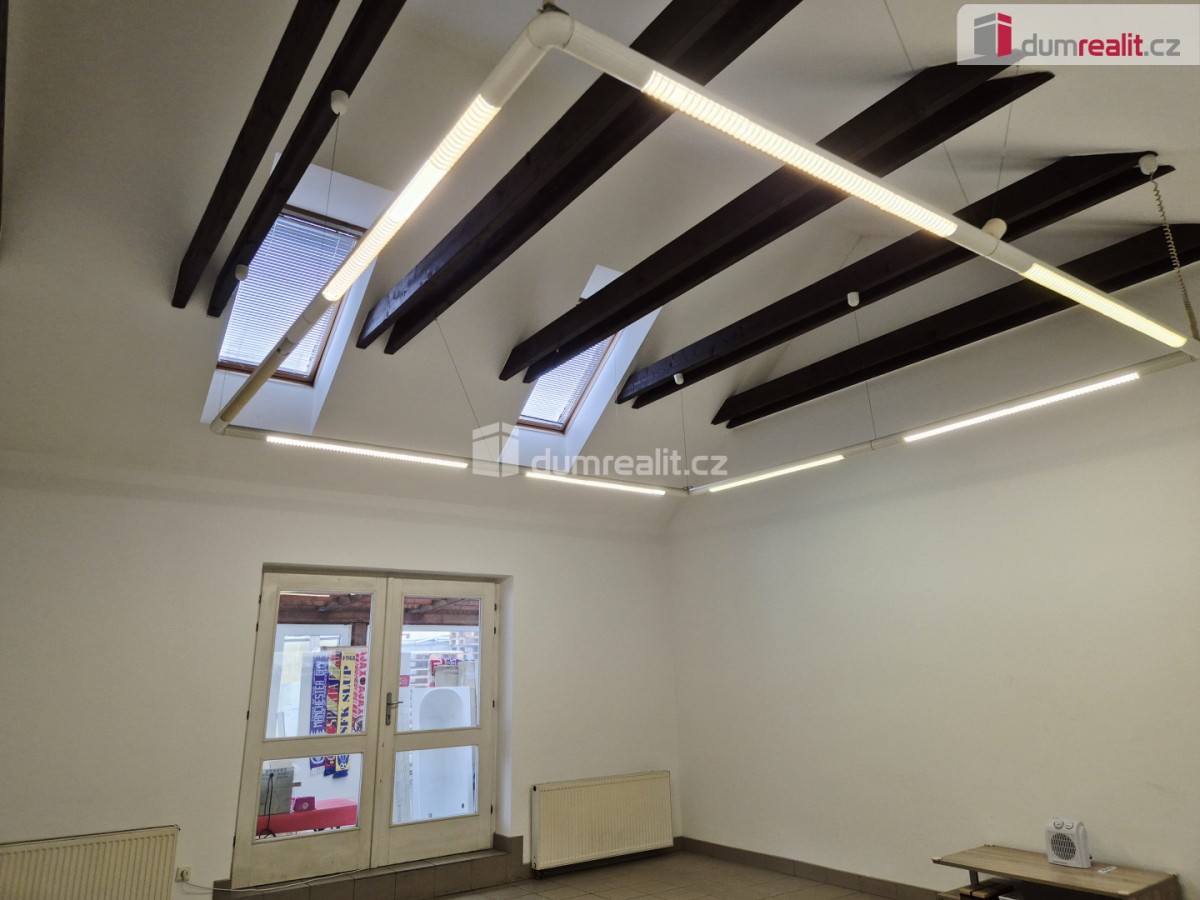 Jedná se o prostory v jednopodlažním domě se dvěma vchody, využitelné k mnoha druhům komerční činnosti: prodej, prezentace, sídlo firmy, skladování a další. Hlavní vzdušná místnost s přiznanou stavbou střešní konstrukce a s přístupem na prosklenou, zastřešenou verandu o 15, 5 m², nabízí necelých 40 m² podlahové plochy. Naproti přes chodbu se pak nachází další místnost o 9, 1 m² a zázemí s umyvadlem, sprchovým koutem, samostatným sociální zařízení WC, viz půdorys ve fotogalerii.