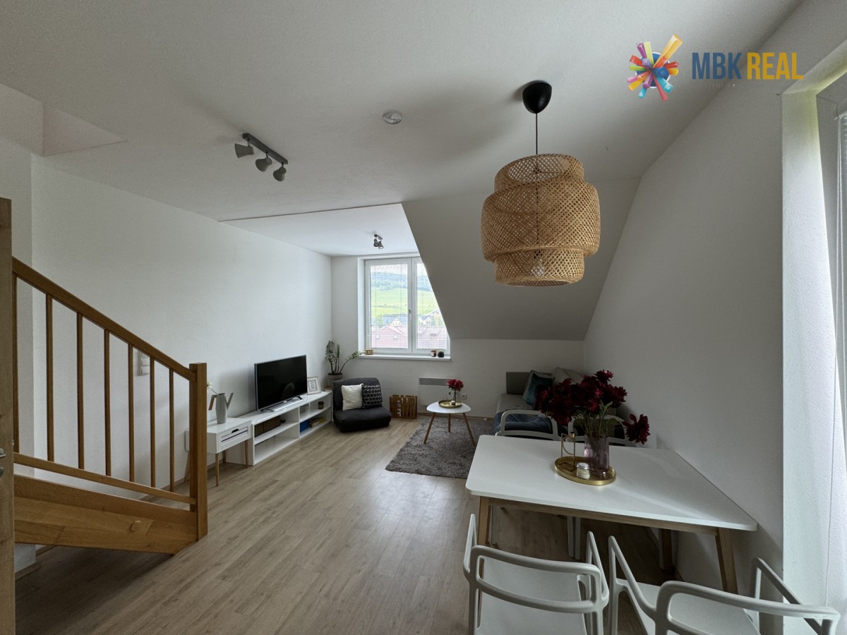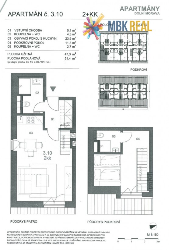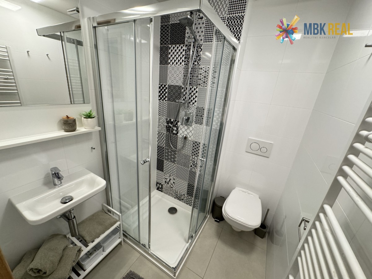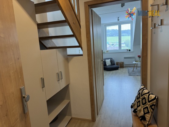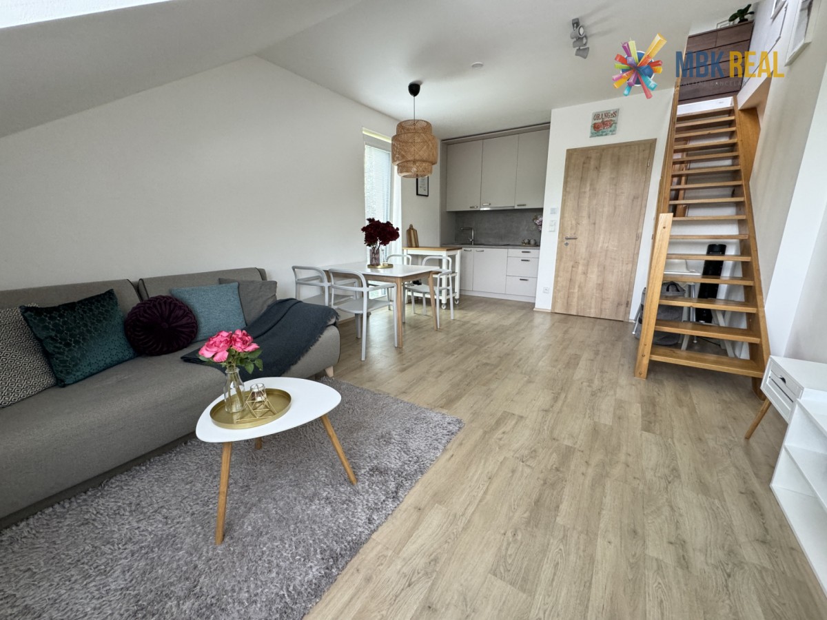 dispozice 2+kk - mezonetový apartmán o vel. 51 m2 se nachází v 2. patře apartmánového domu s dvěma koupelnami vyhřívané podlahovým topení a sociální zařízení WC dohromady.