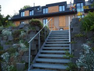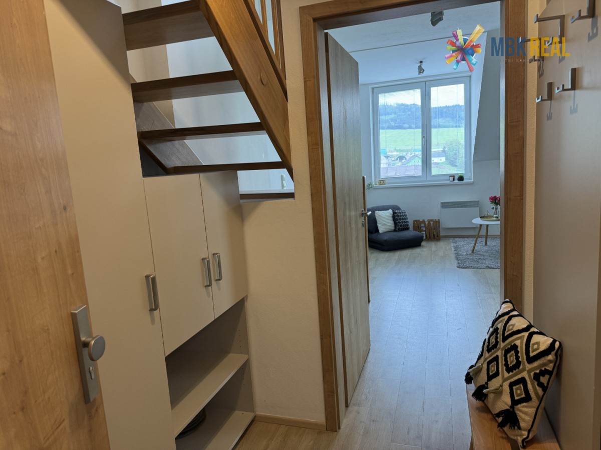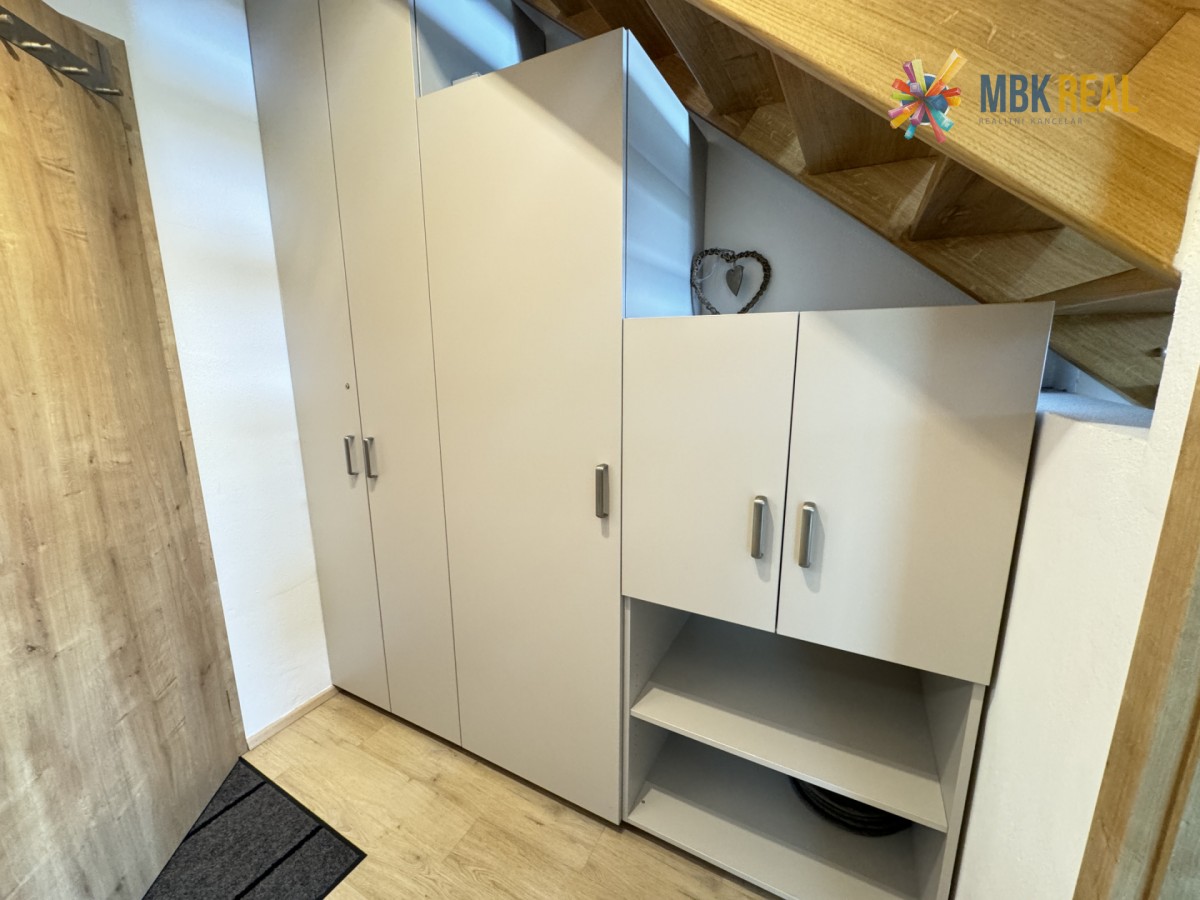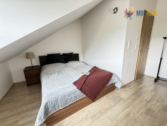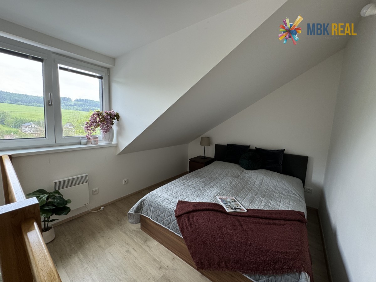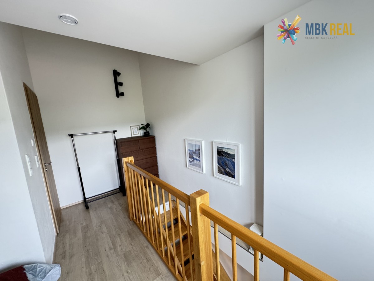 V podkroví se nachází útulná ložnice s moc hezkým výhledem a komfortní druhá koupelna, masivní dřevěné schodiště stylově rozděluje tento prostor.