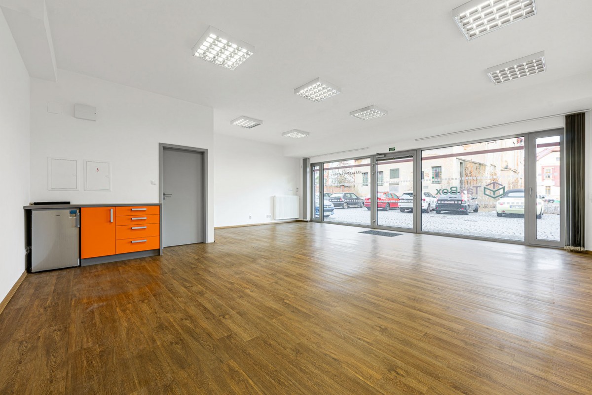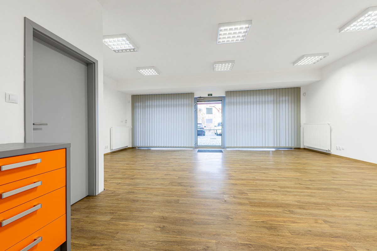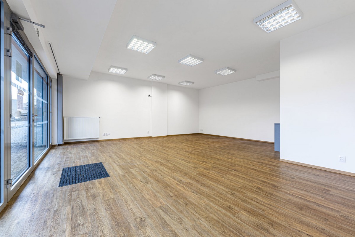 Výloha, která pokrývá celou východní stěnu kancel...áří, dodává prostoru příjemné denní světlo. Je však možné využít žaluzie. Prostor je elektronicky zabezpečen s možností napojení na PCO.