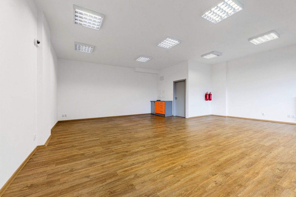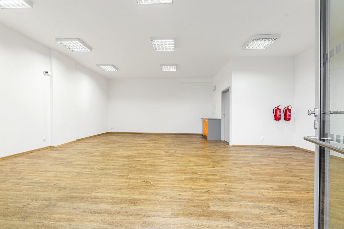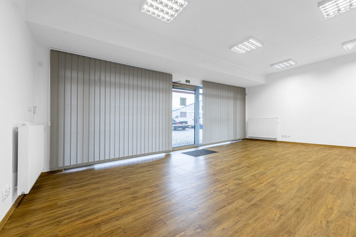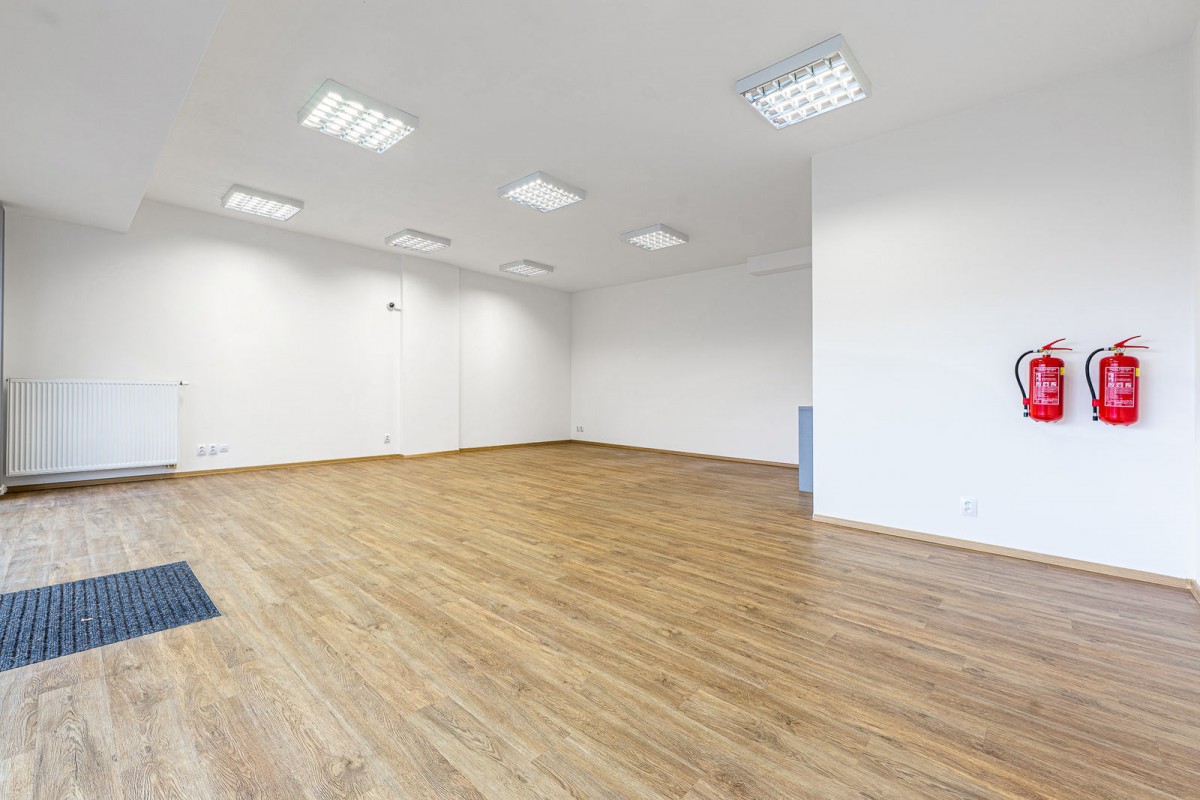 Výloha, která pokrývá celou východní stěnu kancel...áří, dodává prostoru příjemné denní světlo. Je však možné využít žaluzie. Prostor je elektronicky zabezpečen s možností napojení na PCO.
