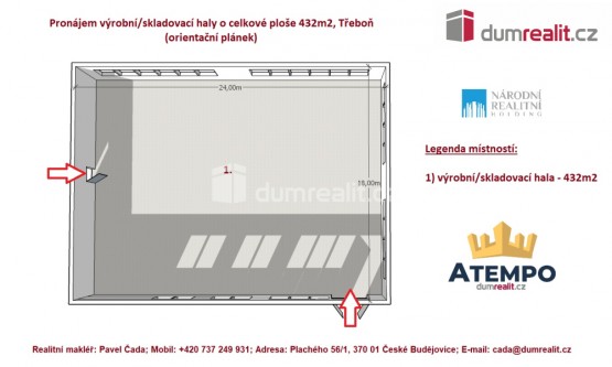 Více info Vám poskytne realitní makléř Pavel Čada. Dumrealit. cz Vám nabízí pronájem výrobních/skladovacích prostor s bezbariérovým přístupem, možností vykládek a nakládek kamionových souprav v areálu Otavan, Třeboň. Jedn...á se o temperovanou halu o celkové výměře 432m², kterou lze využít jako výrobní nebo skladovací prostory. Zároveň je možné si pronajmout venkovní oplocený prostor před logistickou halou o celkové výměře 400m². Dále k tomu nabízíme i možnost pronájmu kancelářského zázemí, šaten a stravovací místnosti o celkové výměře 80, 5m². Veškeré prostory si lze pronajmout i samostatně pouze jako logistickou halu nebo kancelářské zázemí nebo jenom venkovní oplocený prostor. Nebytové komerční prostory se nachází v místě tranzitní křižovatky na Praha, Halámky/České Velenice - Rakousko, Jindřichův Hradec, České Budějovice. Energie jsou fakturovány dle spotřeby (7, - Kč bez DPH za kWh). Paušální poplatek 120, - Kč bez DPH/m²/rok za celoroční připravenost areálu. NELZE skladovat hořlaviny a chemické látky. V místě pronájmu lze zřídit sídlo firmy. Areál se nachází 100m od železniční zastávky, 150m od stravovacího zařízení/jídelny. Více info Vám poskytne realitní makléř Pavel Čada z realitní kanceláře A TEMPO s. r. o. fungující pod ochrannou známkou dumrealit. cz. Zajistíme Vám financování a veškerý právní servis. Těším se na prohlídce. Ev. číslo: 642576. Energetický štítek: G