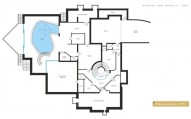 Dispozice tří poschoďového objektu zahrnuje: přízemí - prostorově velkorysý otevřený prostor s krbem a točitým mramorovým schodištěm vedoucím do obytné odpočinkové zóny. Dále kuchyně včetně výtahu z potravinového skladu, jídelnou, místnost s krbem, prostorná pracovna, šatna, další dva samostatné pokoje, 2 koupelny, 3 toalety, vstupní hala, šatna, 1. patro - odpočinková část - 5 ložnic, 5 koupelen s vanou, 5 šaten, 5 teras s výhledy do zeleně. Suterén zahrnuje privátní wellness zónu, terasu pro slunění, sauny, posilovnu, domácí kino s barem a vinotékou, společenská místnost, prádelnu, mandl, technickou místnost, potravinový sklad, kotelna. Další příslušenství tvoří prostorná zimní zahrada s posezením a vstupem po točitých schodech do wellness a do domácího kina a do společenské místnosti.