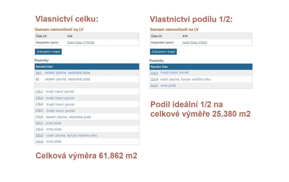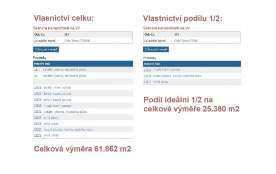 Předmětem prodeje jsou pozemky zapsané na LV č. 534 o celkové výměře 61. 862 m2 a spoluvlastnický podíl o velikosti ideální 1/2... na pozemcích zapsaných na LV 474 o celkové výměře 25. 380 m2, vše pro katastrální území Dolní Týnec.