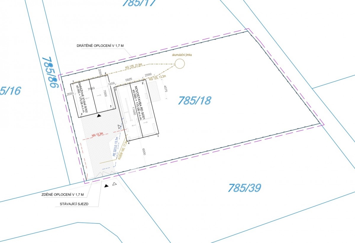 K pozemku byl v roce 2018 zpracován projekt rodinného domu,  který je nedokončený.  Zastavěná plocha domu a garáže cca 115 m2,  podlahová plocha domu cca 104 m2 a plocha garáže 46 m2.