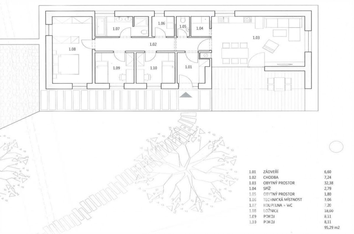 Předmětem koupě je také spoluvlastnický podíl na pozemku, který zajišťuje příjezdovou cestu. Součástí nabídky je dále stavební projekt rodinného domu a garáže včetně stavebního povolení. Projektovaný dům o podlahové ploše 95, 29 m2 řešený jako 4+kk. Samostatně stojící garáž pro dvě osobní auta. U pozemku je připraveno připojení na kanalizaci, obecní vodovod a elektřinu. Energetická náročnost projektovaného domu je třída B - Velmi úsporná.