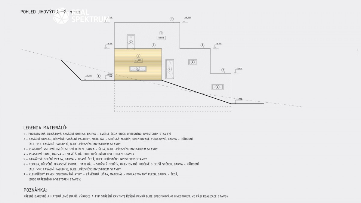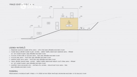 - 1. NP (první nadzemní patro) – 174, 65 m2 (obývací pokoj s kuchyňským koutem, 2 krát ložnice, sociální zařízení WC, koupelna) + terasa