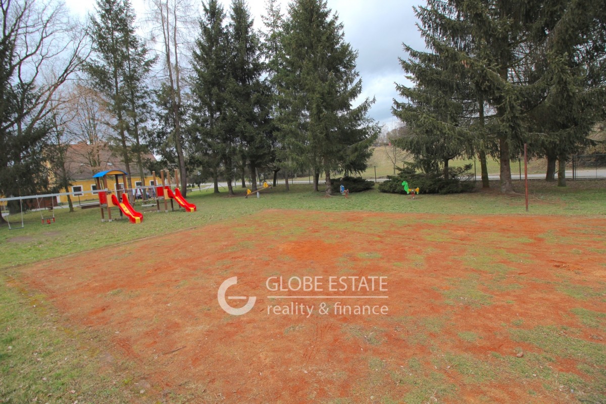 V okolí domu je základní občanská vybavenost, přes silnici dětské hřiště.