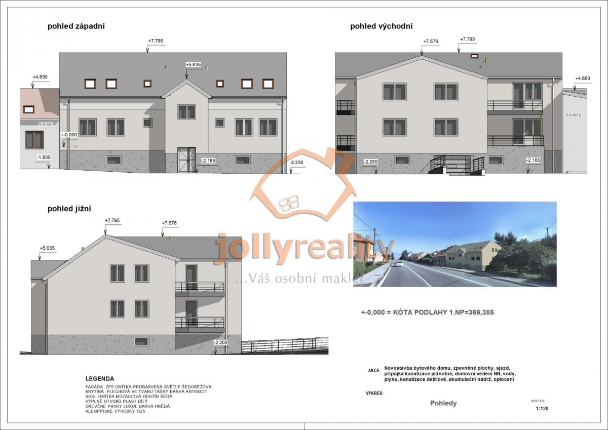 Projekt počítá se zastavěnou plochou bytového domu 289, 8 m2, v 1. NP (první nadzemní patro) jsou umístěny , sklepy a parkovací stání, ve 2. NP (druhé nadzemní patro). a 3. NP (třetí nadzemní patro). jsou umístěny jednotlivé byty od 1+kk (25, 8 m2) až po 3+kk (72 m2). Většina oken bytů plánovaného projektu je orientovaná do vnitrobloku. Menší část oken bude směrem k hlavní komunikaci. Na pozemku jsou všechny inženýrské sítě. Majitelé prodávají pozemek včetně projektu za cenu 4. 410. 000, - Kč včetně provize. Investiční záměr na výstavbu bytů je vhodné konzultovat se zastupiteli obce.