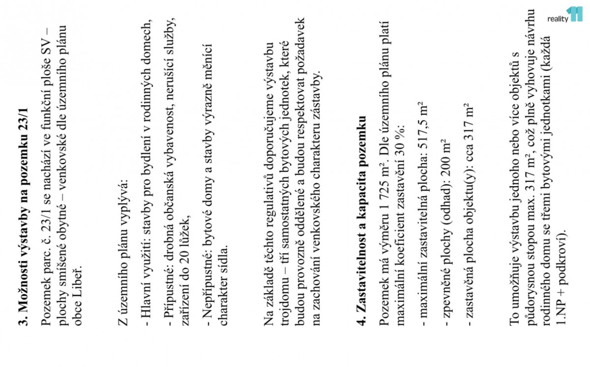 Již máme vypracovanou studii pro výstavbu rodinného domu o třech bytových jednotkách, ale je dle územního plánu možnost stavby pro bydlení v rodinných domech, možná drobná občanská vybavenost, nerušící služby, zařízení do 20 - ti lůžek, nepřípustné jsou bytové domy.