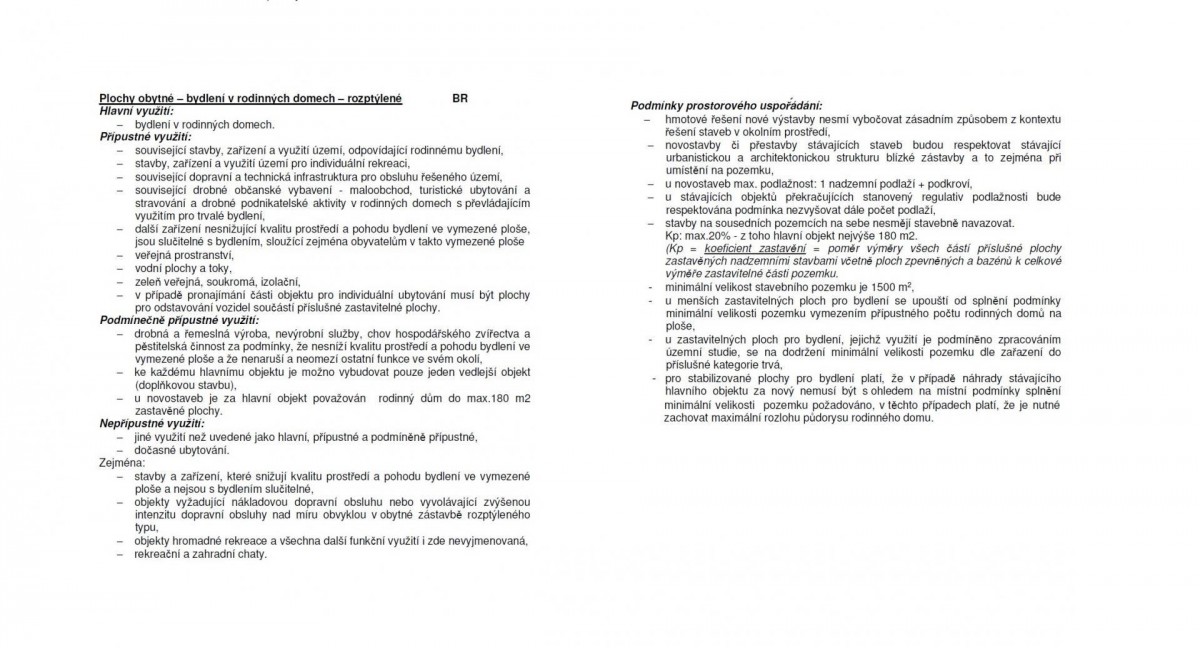 Dle územního plánu je zařazen do do ploch obytných  -  bydlení v rodinných domech  -  rozptýlených,  určených ke stavbě pro bydlení i rekreaci či kombinaci s podnikáním  -  podlažnost 1 NP + obytné podkroví,  zastavitelnost max.  20%.