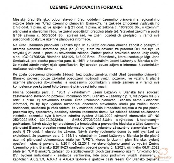 Na základě žádosti současného vlastníka pozemku bylo k tomuto záměru vydáno 21. 6. 2022 Závazné stanovisko, že návrh projektu RD (rodinný dům) 5+KK je bezproblémový. Více v příloze UPI.