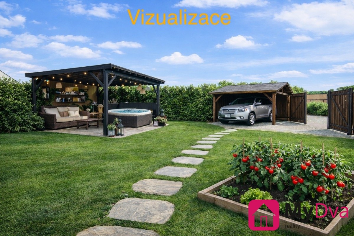 Mezi fotografiemi jsou také vizualizace (ilustrační návrhy), které názorně ukazují možné využití stavební parcely. Přibližují například možnost výstavby domu (i dvoupodlažního, se zimní zahradou či balkonem) a doplnění zázemí jako pergola, zahradní kuchyň, relaxační zóna, parkování/přístřešek pro auto i napojení příjezdové cesty od hlavní silnice, která je součástí pozemku. Vizualizace mají inspirativní charakter.