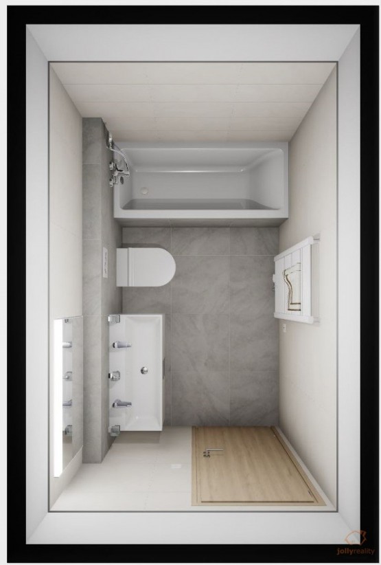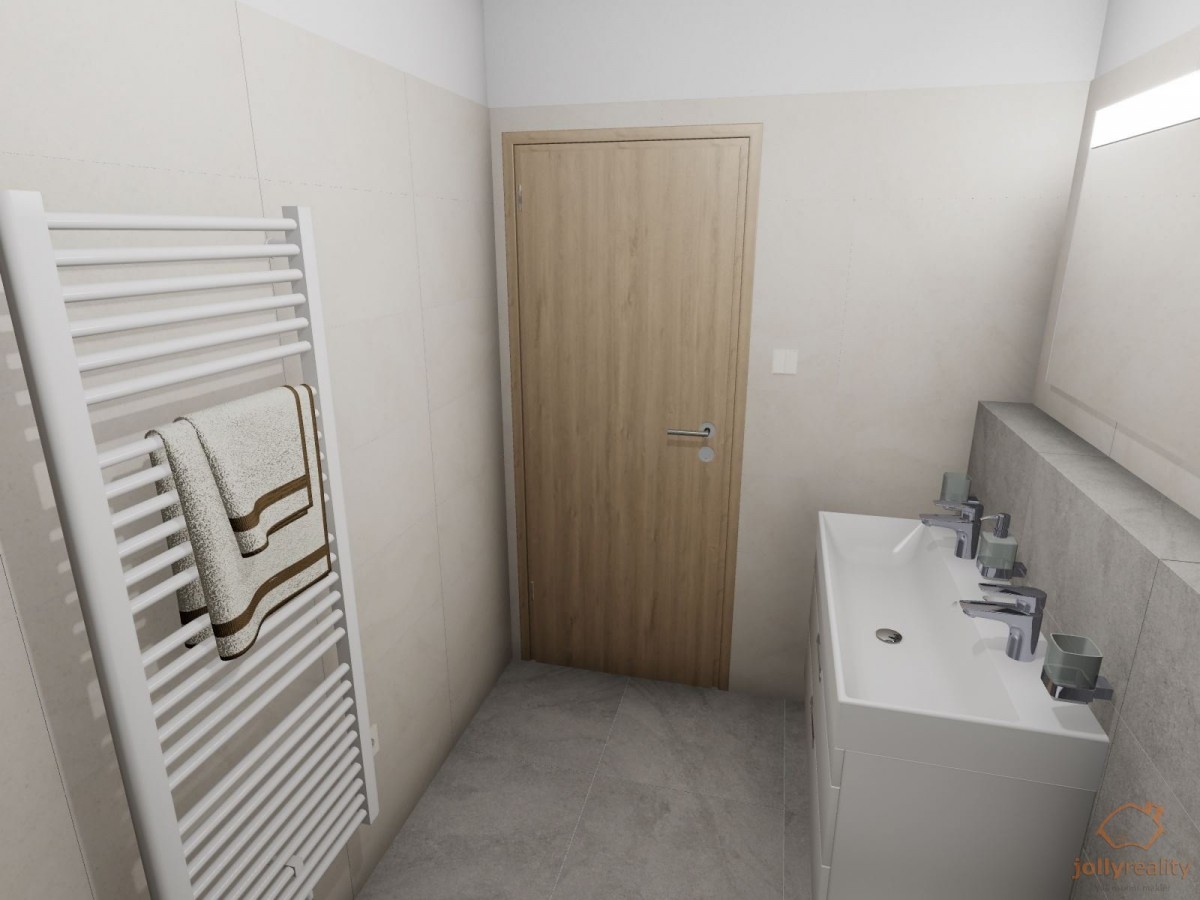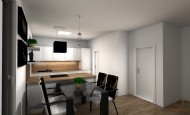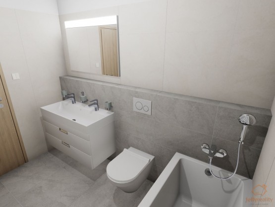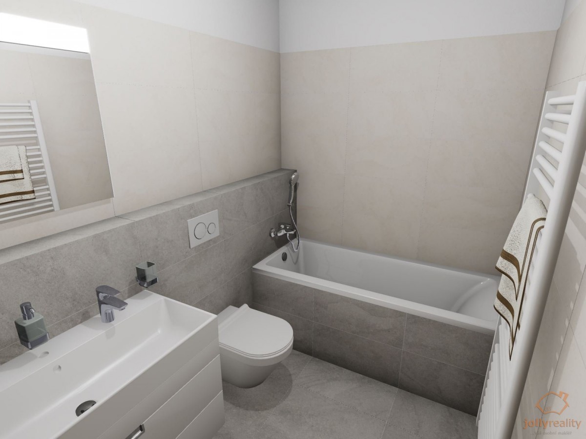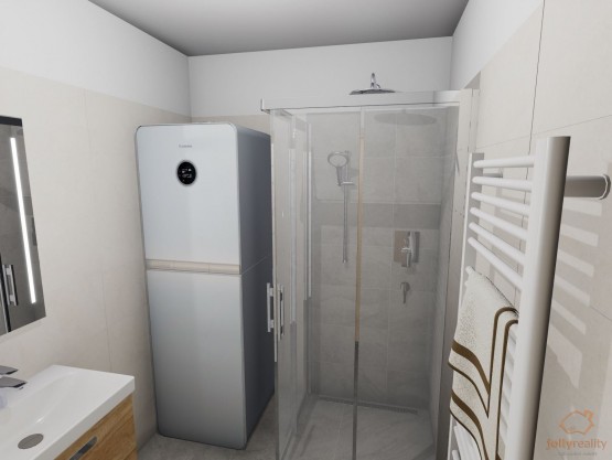 Jednotka umí i chladit v letních měsících. V koupelnách a na sociální zařízení WC bude elektrické podlahové topení. V místnostech elektrické přímotopy.