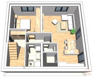 Po schodišti se vchází do 2. NP (druhé nadzemní patro). , kde jsou tři pokoje 13, 74 m2, 18, 03 m2a 12, 36 m2, koupelna 4, 89 m2, technická místnost - šatna 4, 67 m2, kde je možnost přístupu na půdu. Ložnice je rozdělena na část, kde je místo na dvojlůžko s toaletními stolky a část, kde je možné vybudovat menší pracovnu. U vstupu je nika na umístění vestavěných skříní.