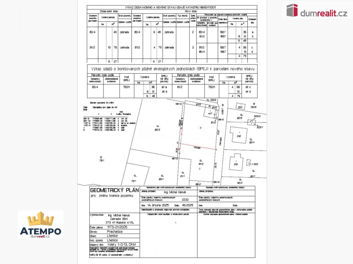 Více info Vám poskytne realitní makléř Tomáš Pelda. . Dumrealit. cz Vám nabízí prodej stavebního pozemku o výměře 648 m² v zástavbě rodinných domů v ulici Zahradní ve městys Lhenice. Prodávaný pozemek je část pozemku parc. ... č. 81/2 a část pozemku parc. č. 80/4 v kú. Lhenice. Pozemek je určen dle územního plánu k výstavbě rodinných domů. Inženýrské sítě (voda, kanalizace, plyn, elektřina) jsou za hranicí oploceného pozemku. K dispozici máme předběžnou informaci o možné zástavbě a vyjádření správců sítí (el. , plyn, kanalizace, voda) v dané lokalitě. V městys Lhenice se nachází veškerá občanská vybavenost (MŠ, ZŠ, lékař, obchody apod. ). Vzdálenost do města České Budějovice je 23 km, do Prachatic 17 km, do Českého Krumlova 23 km, do Černé v Pošumaví 38 km. Zajistíme Vám projektanta, financování a veškerý právní servis. Více info Vám poskytne realitní makléř Tomáš Pelda z realitní kanceláře A TEMPO fungující pod ochrannou známkou dumrealit. cz. Ev. číslo: 650370.