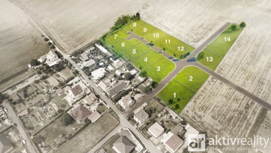 K dispozici je 14 parcel o výměrách od 801 m2 do 2000 m2.