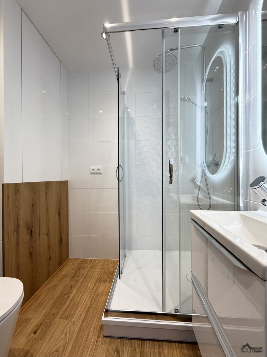 Koupelna je laděná do moderního stylu a nabízí sprchový kout, umyvadlo, toaletu, i přípravu pro pračku a sušičku. Praktickým bonusem je také vestavěná skříň v chodbě, která bude realizována v lednu 2026 a ještě víc zpříjemní každodenní fungování.