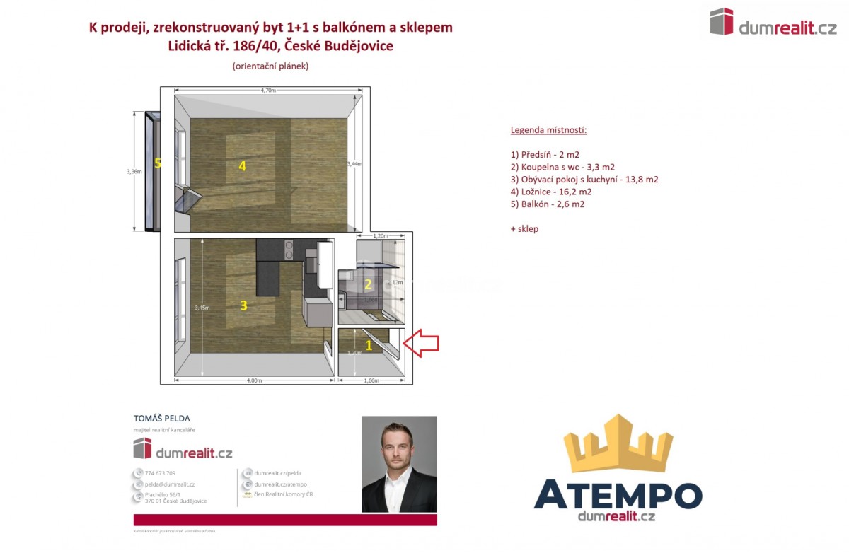 Cena je včetně provize RK a právního servisu. Více info Vám poskytne makléř Tomáš Pelda. . Dumrealit. cz Vám nabízí prodej zrekonstruovaného bytu 1+1 s balkónem a sklepem v širším cen...tru města České Budějovice, ul. Lidická tř. 186/40 (u Polikliniky Jih). Byt. jednotka se nachází ve 2. patře v zatepleném panelovém domě včetně výtahu. Byt je situovaný na východní světovou stranu a prošel kompletní rekonstrukcí v roce 2017. Náklady na provoz bytu činí 2. 600, - Kč bez elektrické energie a internetové připojeníu. V okolí je veškerá občanská vybavenost. Zajistíme Vám financování a veškerý právní servis. Více info Vám poskytne realitní makléř Tomáš Pelda z realitní kanceláře A TEMPO fungující pod ochranou známkou dumrealit. cz. Ev. číslo: 655312. Energetický štítek: G