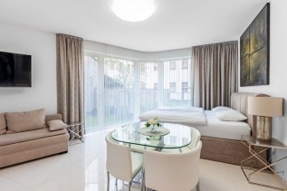 Obytná plocha bytu je 40 m2 a jeho dispozici tvoří předsíň včetně šatní skříně, prostorný pokoj se vstupem na terasu a vlastní zahradu, jídelní část s kuchyňským koutem, plně vybavená spotřebiči, koupelna se sprchovým koutem a sociální zařízení WC. Podlahy dlažba, podlahové topení, klimatizace, internetové připojení a domácí telefon. Orientace bytu na jihozápad.