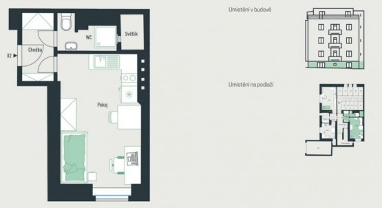 1+kk, 20 m2, cihlová, OV, 1. podlaží