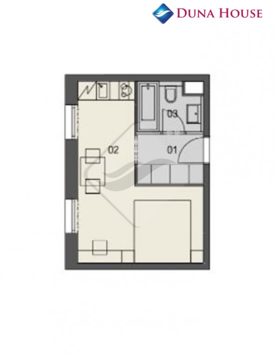 Jednotka bude sestávat ze vstupní předsíně, koupelny s toaletou a vanou a obývacího pokoje s místem pro kuchyňský kout.