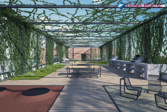 Dům bude disponovat velkou, společnou terasou na střešních prostorách domu a výtahem pro 6 osob. Venkovním i podzemním parkovacím stáním s garážovými vraty s dálkovým ovládáním a automatickým zavřením po vjezdu auta. .