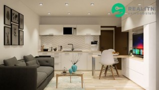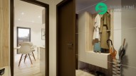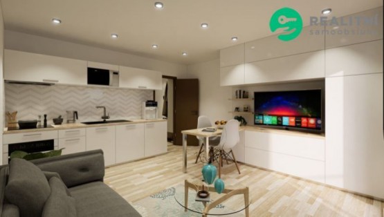 Ze vstupní chodby tohoto bytu, můžete vstoupit do koupelny a obývacího pokoje. Koupelna je již ve standardu kompletně zařízena sprchovým koutem, sprchovou baterií se sprchovým setem, sociální zařízení WC, a již ve standardu do koupelny navíc dodáváme kompletní set umyvadlové skříňky s umyvadlem, vodovodní baterií, zrcadlem a osvětlením. Ve fázi výstavby si můžete vybrat a změnit typ obkladu a dlažby dle svého vkusu. V koupelně je pro větší tepelný komfort navrženo podlahové vytápění. Kuchyňský kout je řešen moderně s obývacím pokojem, jehož nedílnou součástí je i balkon.