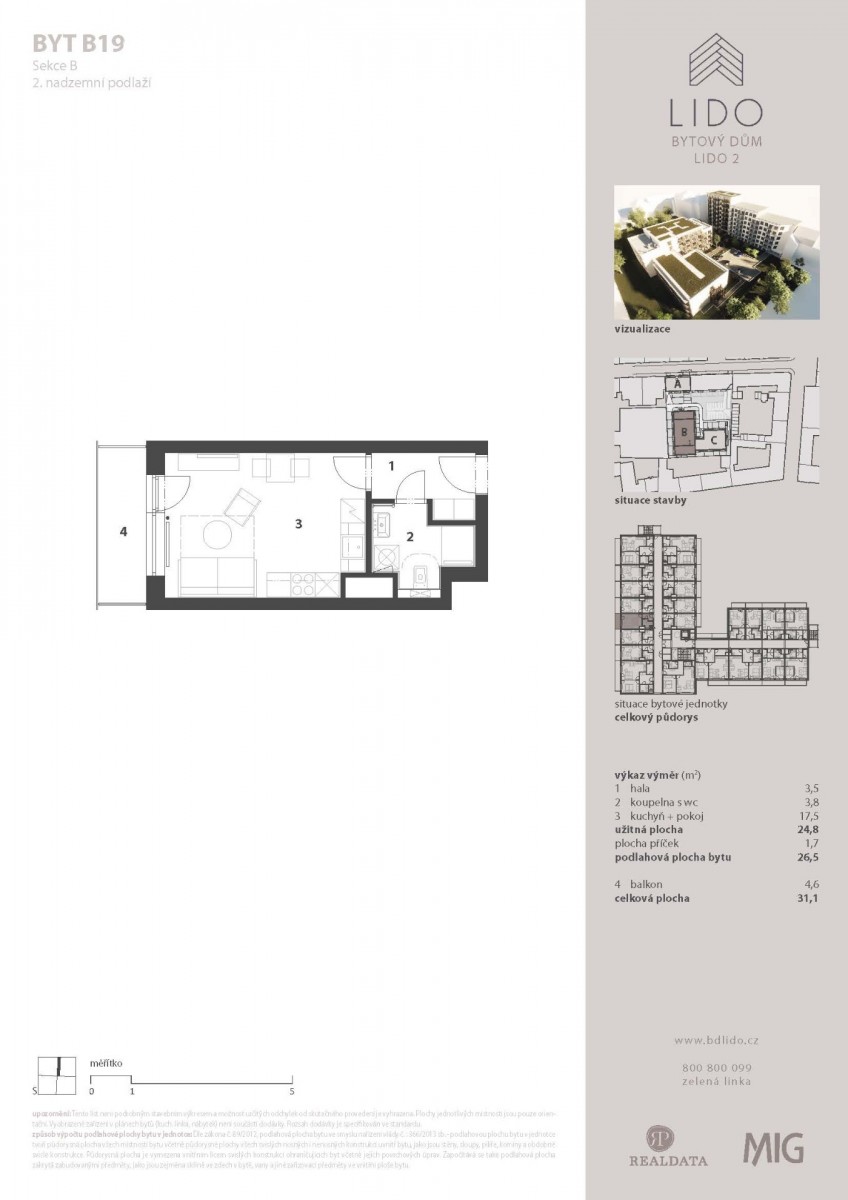 vstupní chodba (3, 5 m²), obývací pokoj s kuchyňským koutem (17, 5 m²), koupelna s sociální zařízení WC (3, 8 m²), balkon (4, 6 m²)