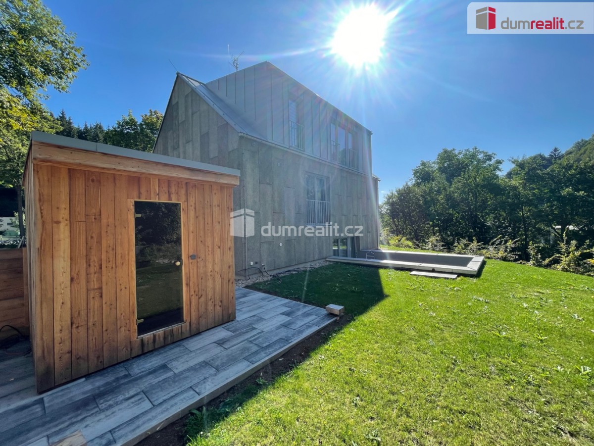 V ceně je rovněž užívací právo na okolní zahradu, venkovní pergol, a finské sauny.