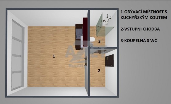 - obytná místnost s kuchyňským koutem cca 5 x 5 m