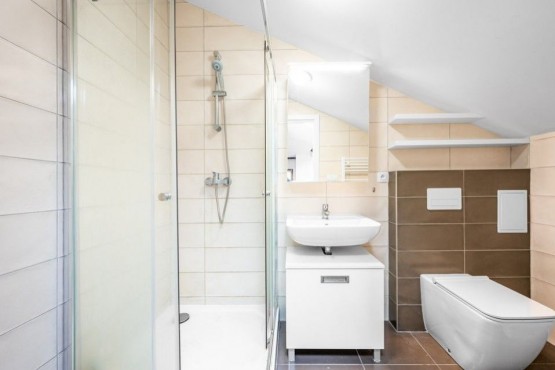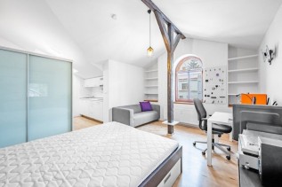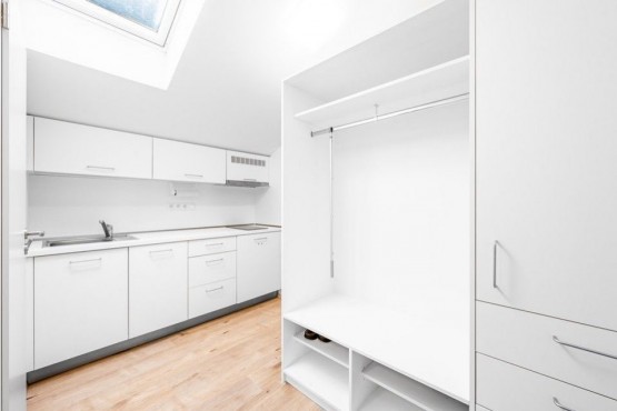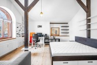 Moderní světlý byt s vysokými stropy v posledním patře domu kompletně rekonstruovaném v r. 2019 je zařízen na míru. Z předsíně, vybavené skříněmi, vedou dveře do koupelny se sprchovým koutem, umyvadlem se skříňkou a zrcadlem, závěsným sociální zařízení WC a pračkou. Bílý kuchyňský kout disponuje vestavěnou lednicí, myčkou 45 cm, indukční varnou deskou a digestoří. Kuchyňským koutem se prochází do hlavního obytného prostoru s dvoulůžkem, matrací, nočním stolkem a úložným prostorem. Dále je prostor vybaven stolem se 3 židlemi, držákem na nástěnnou televizi, dvoumístnou sedačkou, skříní a policemi.