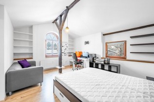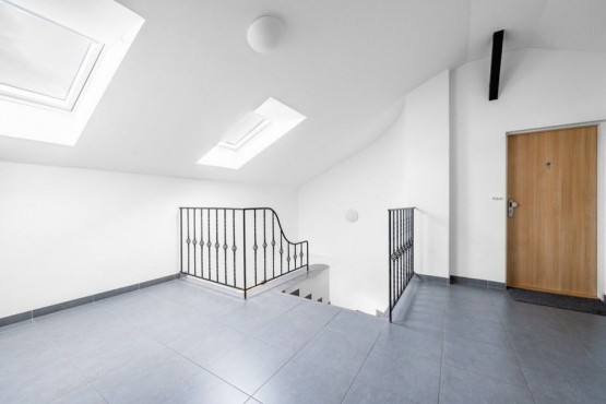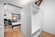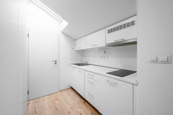 Moderní světlý byt s vysokými stropy v posledním patře domu kompletně rekonstruovaném v r. 2019 je zařízen na míru. Z předsíně, vybavené skříněmi, vedou dveře do koupelny se sprchovým koutem, umyvadlem se skříňkou a zrcadlem, závěsným sociální zařízení WC a pračkou. Bílý kuchyňský kout disponuje vestavěnou lednicí, myčkou 45 cm, indukční varnou deskou a digestoří. Kuchyňským koutem se prochází do hlavního obytného prostoru s dvoulůžkem, matrací, nočním stolkem a úložným prostorem. Dále je prostor vybaven stolem se 3 židlemi, držákem na nástěnnou televizi, dvoumístnou sedačkou, skříní a policemi.