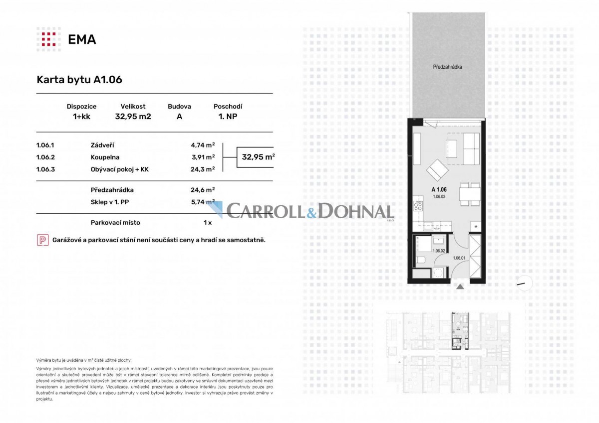 Byt. jednotka 1+kk má výměru užitné plochy 32, 95 m2, předzahrádku o velikosti 24, 6m2 a je situovaná v prvním nadzemním podlaží budovy pod označením A. Standardní vybavení bytu splňuje podmínky moderního bydlení ( podlahové vytápění - kombinace plynového kotle a FVE panelů na střeše budovy, obložkové zárubně, moderní keramické obklady, francouzská okna, příprava na elektricky ovládané žaluzie, příprava pro nabíječky elektro automobilů atd. ). Design bytu si můžete upravit dle vlastních požadavků.