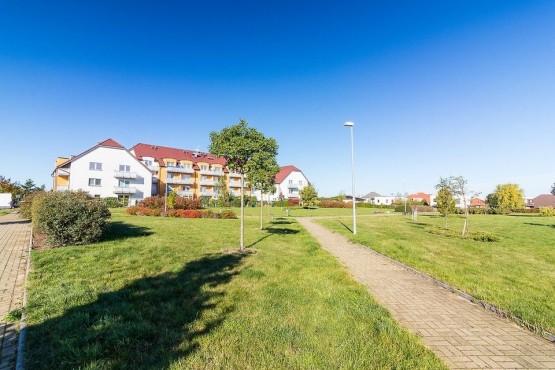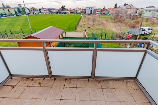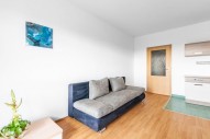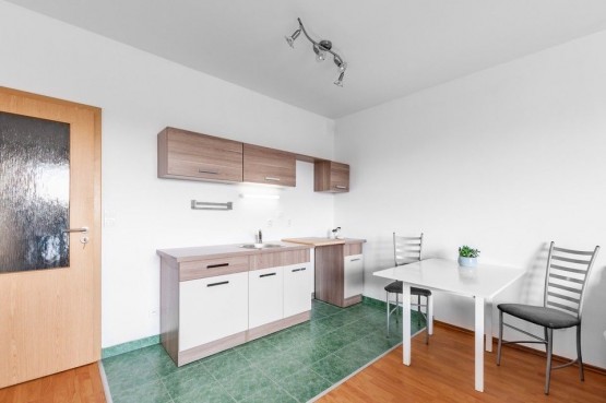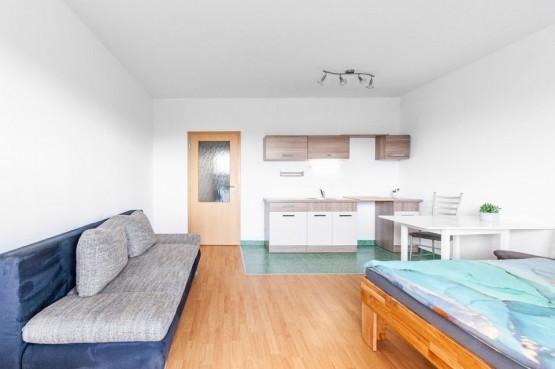 Byt sestává z hlavní obytné místnosti s kuchyňským koutem o ploše 22, 5 m2, předsíně 3, 3 m2 s úložnými prostory, koupelny se sprchovým koutem, sociální zařízení WC a místem pro pračku a případně i sušičku 3, 8 m2. Na prostornou a světlou obytnou místnost navazuje prostorný, slunný balkon 5, 1 m2 s příjemným volným výhledem do zeleně.
