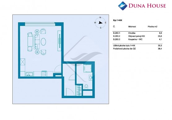 Byt 1+kk, 36, 4 m2... velký, sestávající ze vstupní předsíně, koupelny s toaletou a prostorného pokoje s kuchyňským koutem, je situovaný v 1. NP (první nadzemní patro) nového viladomu.