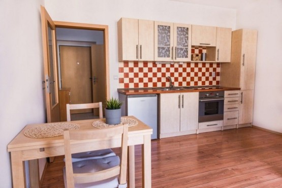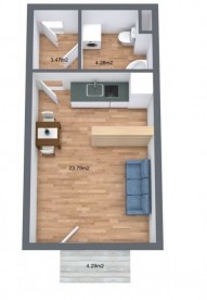 Dispozice bytu 1kk zahrnuje otevřený koncept obývacího pokoje se spací částí, kuchyňská linka s jídelním posezením a přímý výstup na terasu s výhledy do okolí, vstupní chodba, koupelna se sprchovým koutem, místem pro pračku, sklep.