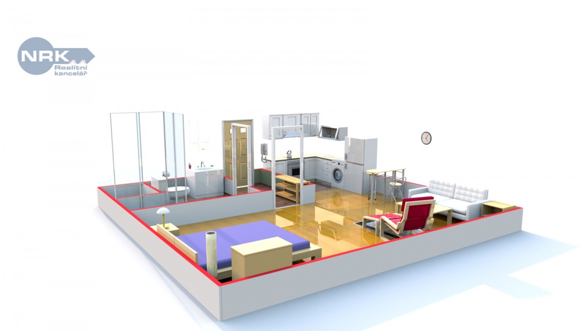 Zařízený byt (prodává se včetně nábytku) je dispozičně řešen prostorným obývacím pokojem s kuchyňským koutem na míru včetně spotřebičů (sklokeramická varná deska, digestoř, horkovzdušná trouba, samostatná kombinovaná lednice s mrazákem a dále pračka). Z předsíně pak vstoupíte do koupelny se sprchovým koutem, umyvadlem a toaletou. Vybavení bytu - již zmíněná kuchyň se spotřebiči, barový jídelní stůl se židlemi, šatní skříň, sedací souprava, konf. stolek, křeslo, komoda, noční stolek, botník, věšák. Z toho důvodu je nabídka i zajímavá investice pro případný pronájem. Mezi další výhody tohoto bytu patří téměř okamžité nastěhování. Možnost pronájmu gar. stání v suterénu domu.