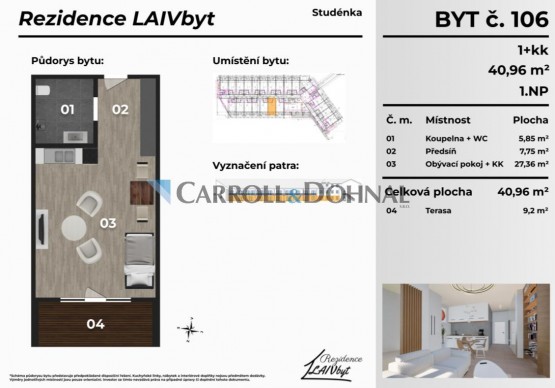 Byt č. 106 se nachází v 1. NP (první nadzemní patro), má dispozici 1+kk a užitnou plochu 40, 9 m. K bytu náleží terasa o velikosti 9, 2 m a předzahrádka 15 m, což zajišťuje příjemné venkovní zázemí.