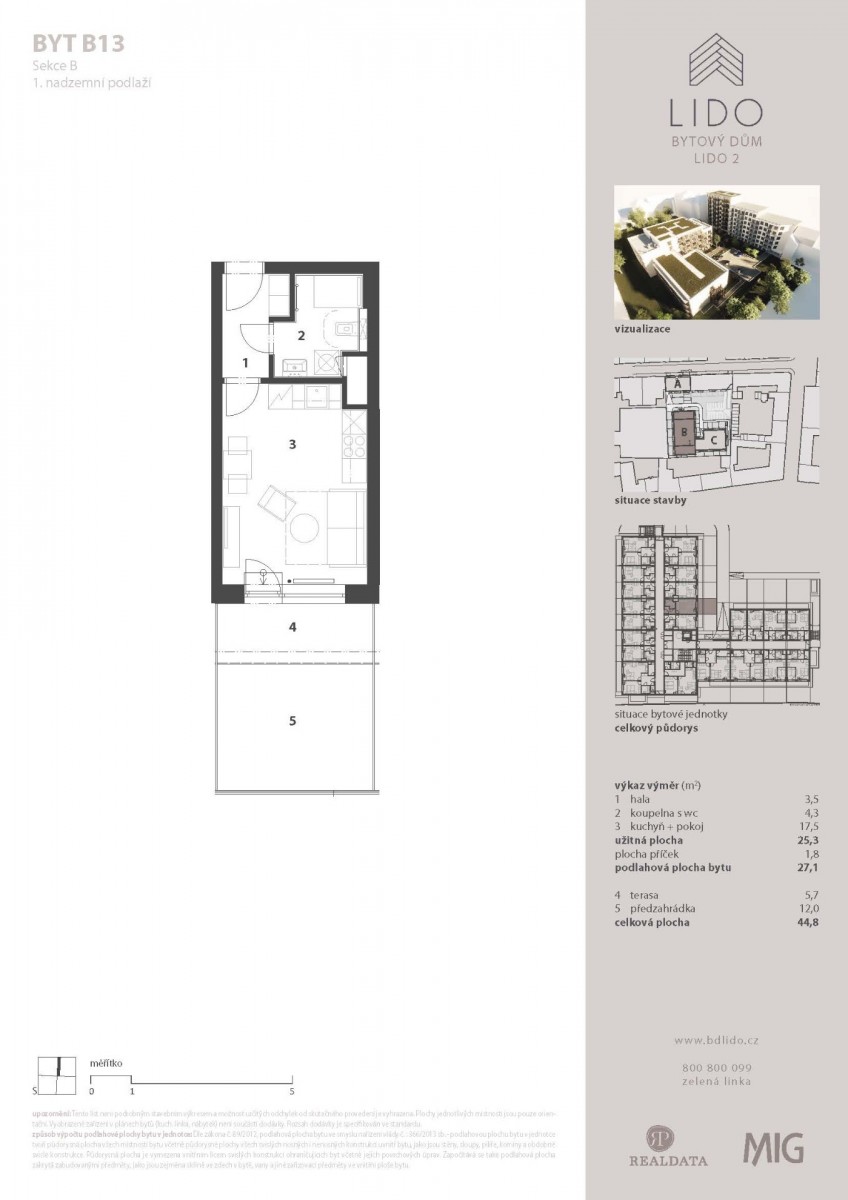 vstupní chodba (3, 5 m²), obývací pokoj s kuchyňským koutem (17, 5 m²), koupelna s sociální zařízení WC (4, 3 m²), terasa (5, 7 m²), předzahrádka (12, 0 m²)