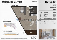 Byt č. 101 se nachází v 1. NP (první nadzemní patro), má dispozici 1+kk flexi a užitnou plochu 62, 62 m. K bytu náleží terasa o velikosti 8, 1 m.