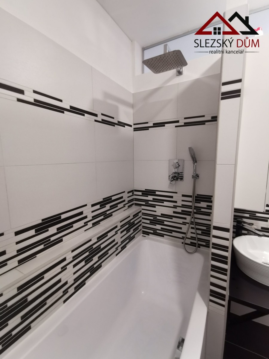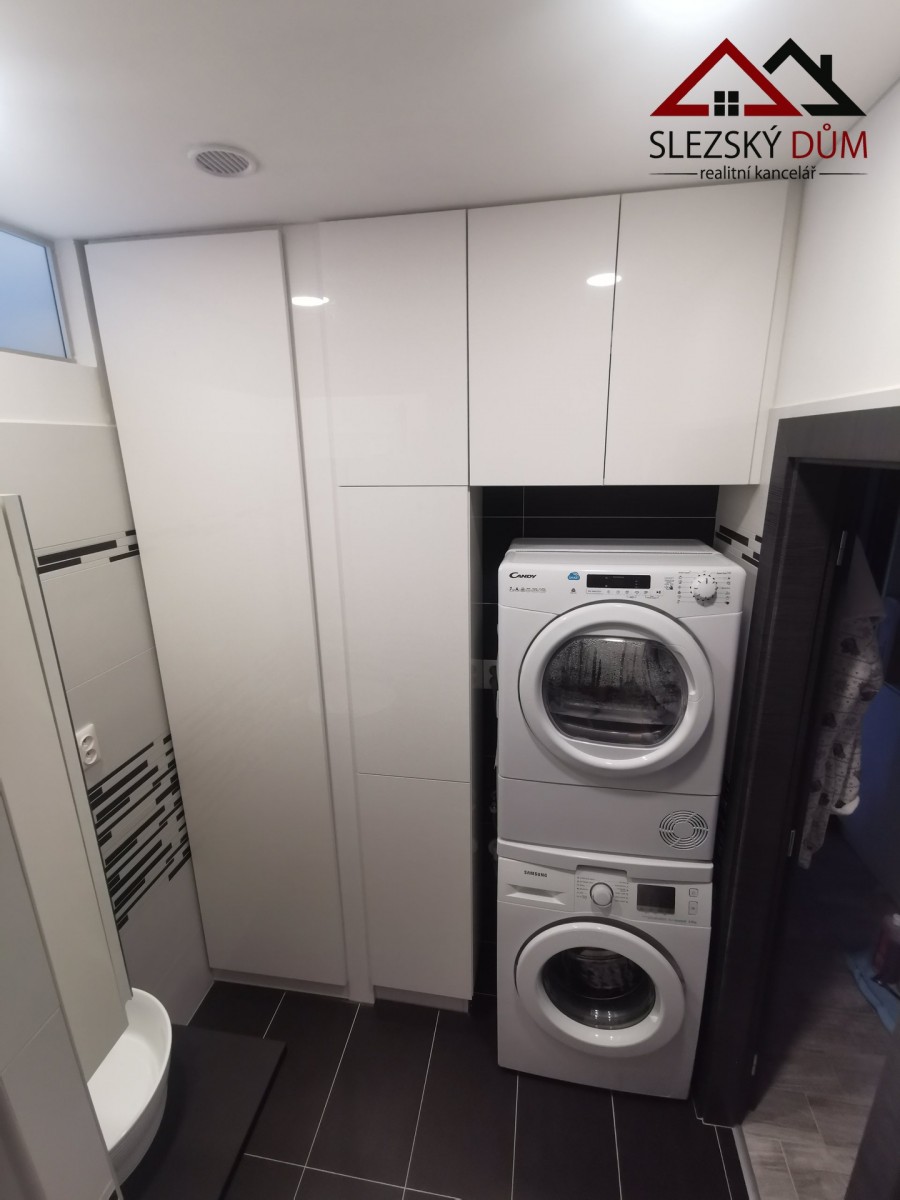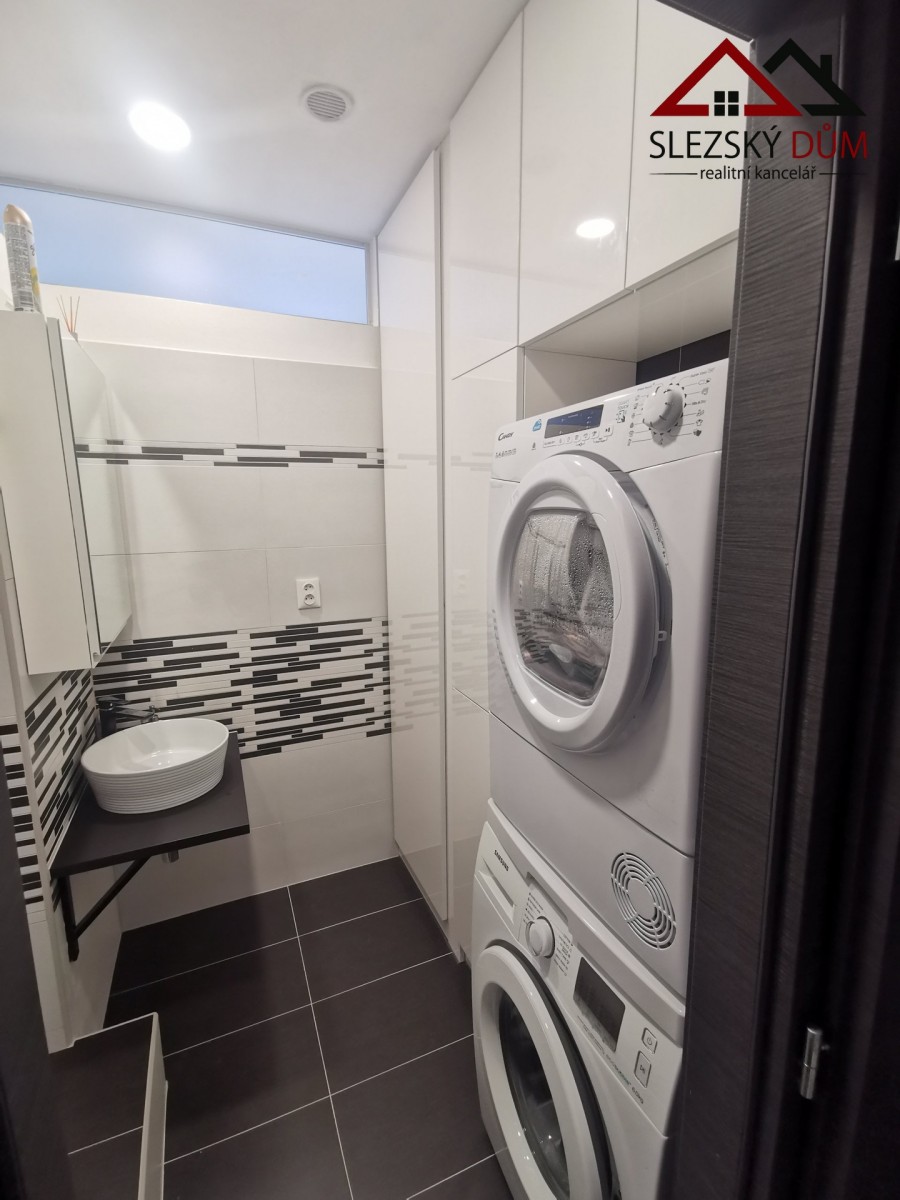 Kuchyň je řešená moderní linkou s indukční varnou deskou a vestavnou troubou. Koupelna je ve světlém, čistém provedení, na fotkách je vidět vana a prakticky řešený prostor pro pračku (případně i sušičku). sociální zařízení WC je samostatné.