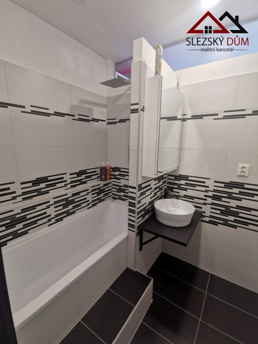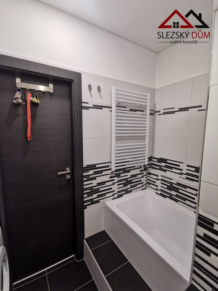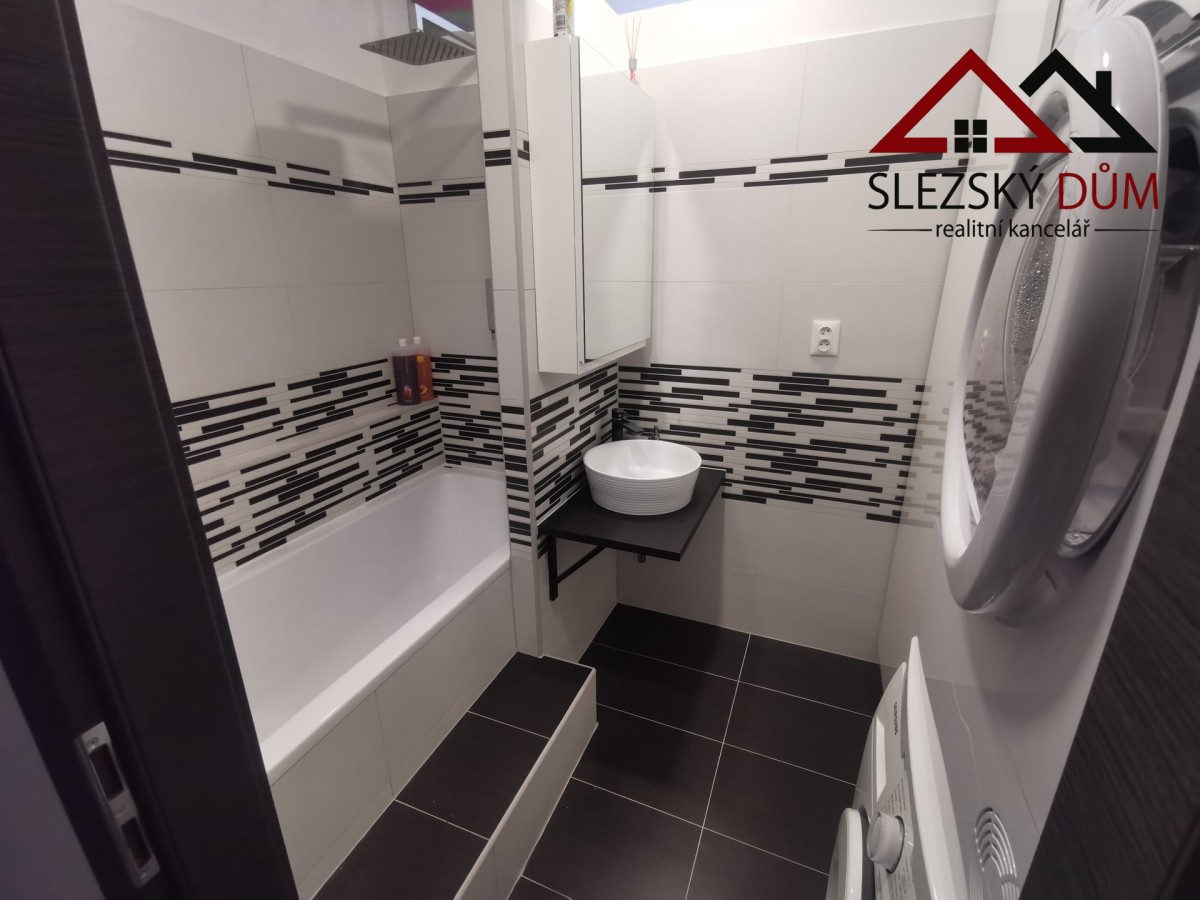 Kuchyň je řešená moderní linkou s indukční varnou deskou a vestavnou troubou. Koupelna je ve světlém, čistém provedení, na fotkách je vidět vana a prakticky řešený prostor pro pračku (případně i sušičku). sociální zařízení WC je samostatné.