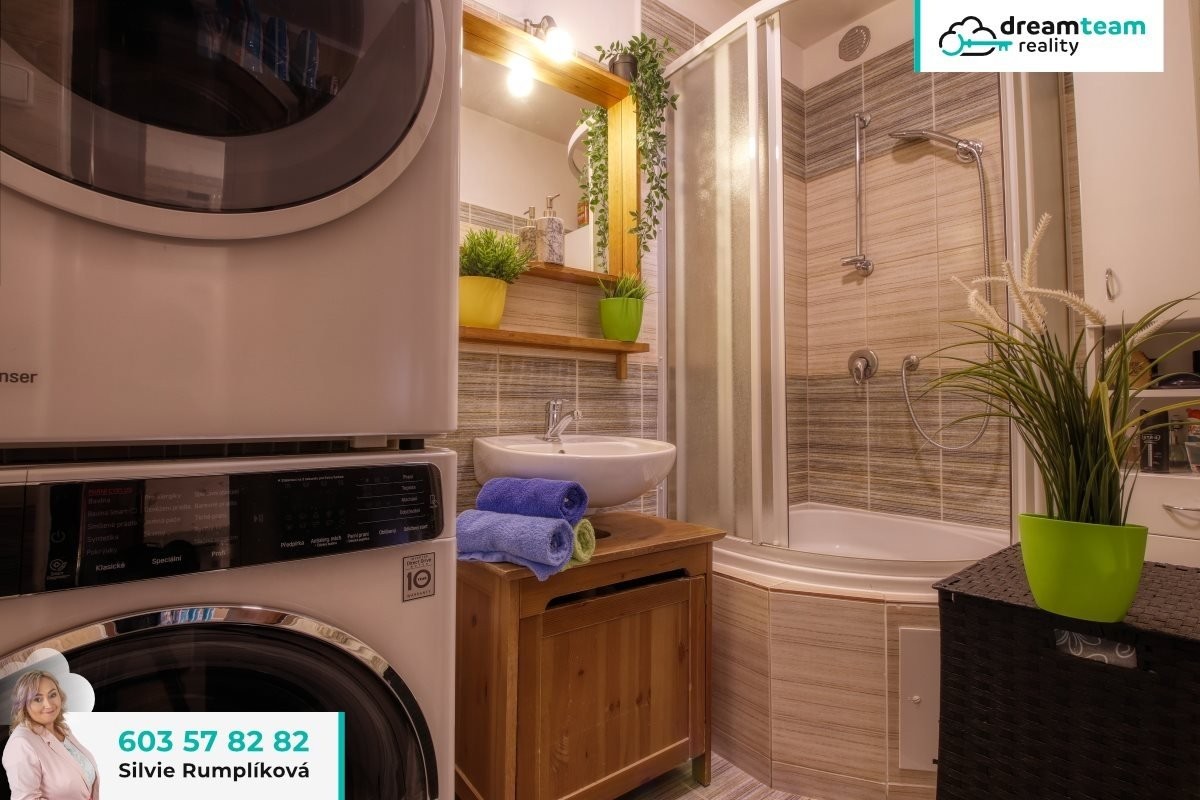 Jádrem bytu je vždy koupelna. Byla moc pěkně zrekonstruována a je v decentních barvách, které si krásně doladíte s libovolnou barvou doplňků. V rámci rekonstrukce chytře rozšířili prostor koupelny i o vedlejší chodbu a získali tím hezkých pár metrů navíc. Jestli máte v koupelně rádi prostor a dostatek místa na pračku se sušičkou a sprchový kout, pak to je to pravé ořechové pro Vás.