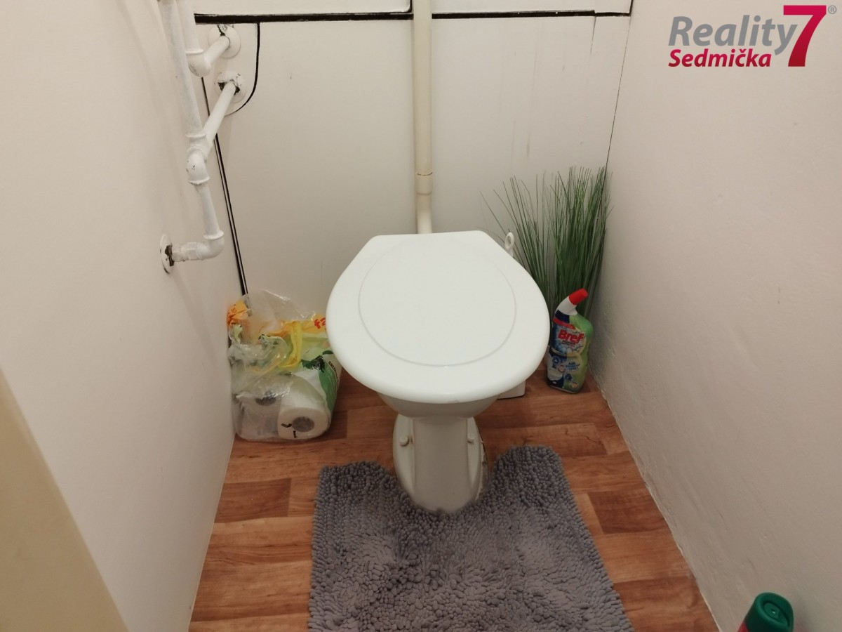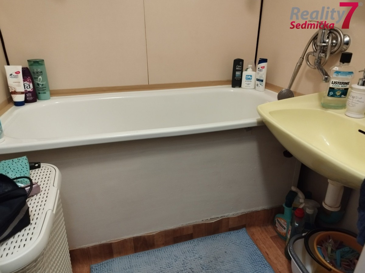 V koupelně je vana, sociální zařízení WC je samostatně. V bytě zůstane skříň, sedačka, stůl... a židle, pračka, psací stůl a skříňky v obýváku. K bytu patří 2 sklepy, menší cca 6m2, větší cca 12m2.